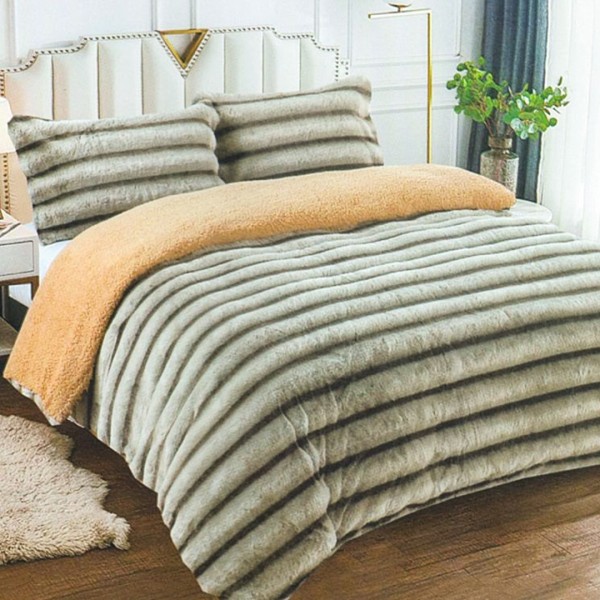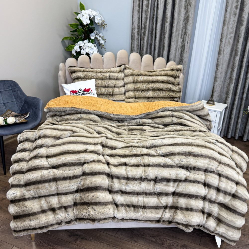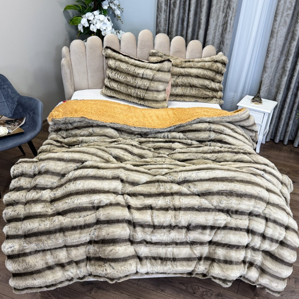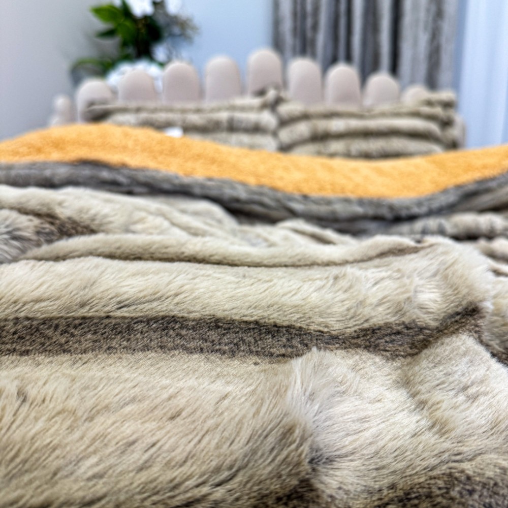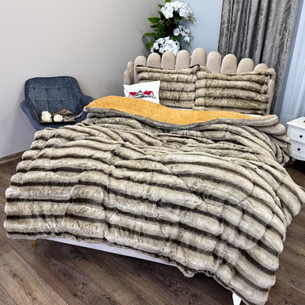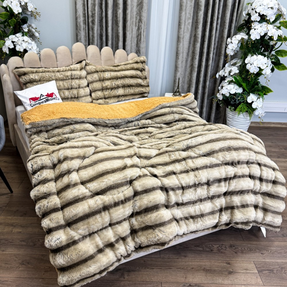Pilota Groasă cu Fața din Blăniță Artificială de Iepure Dungat și Dos din Blăniță Sherpa, Umplutură Vatelină Siliconică, 200x230 cm + 2 fete de perna 50x70cm - Confort Termic Premium și Eleganță pentru Nopți Racoroase, Bej, Cocolino, cod produs: CSA-PF15