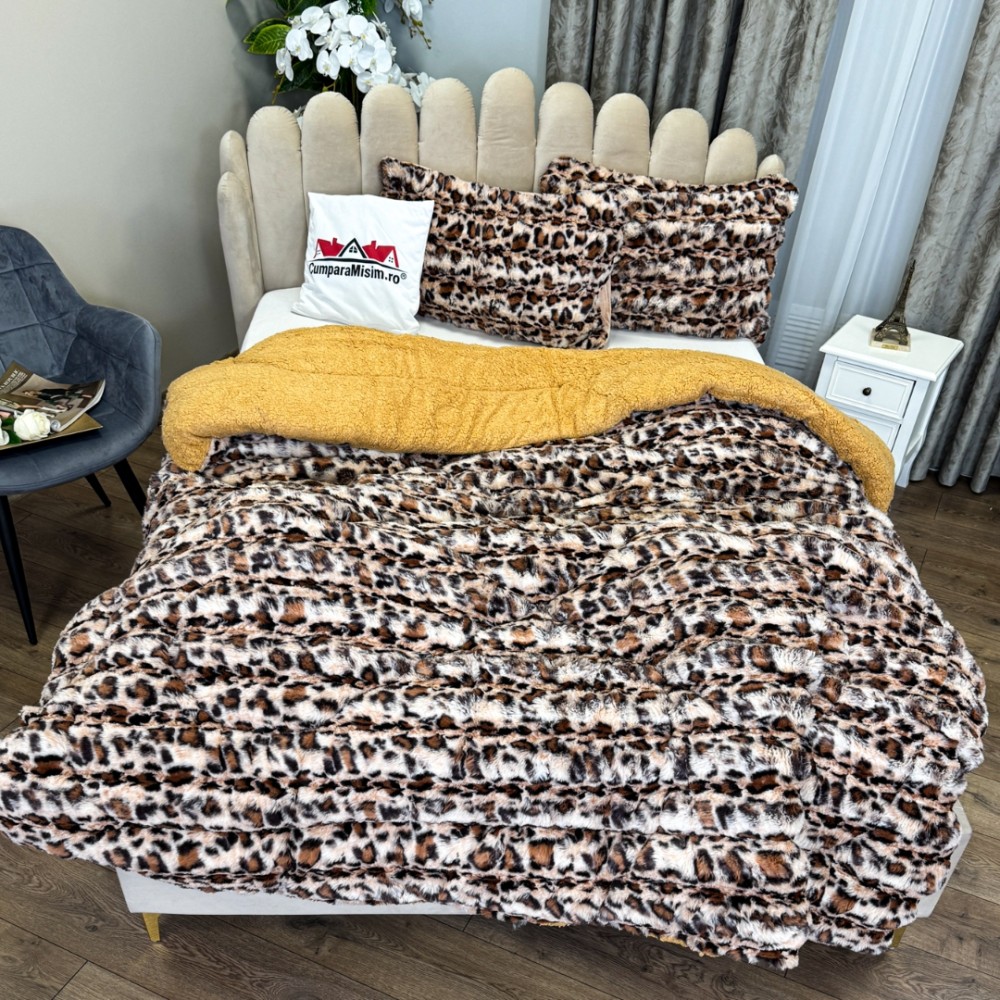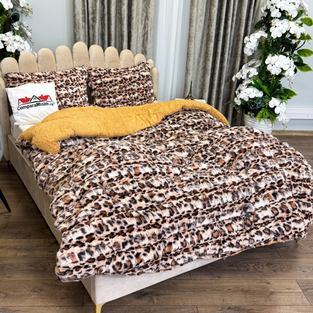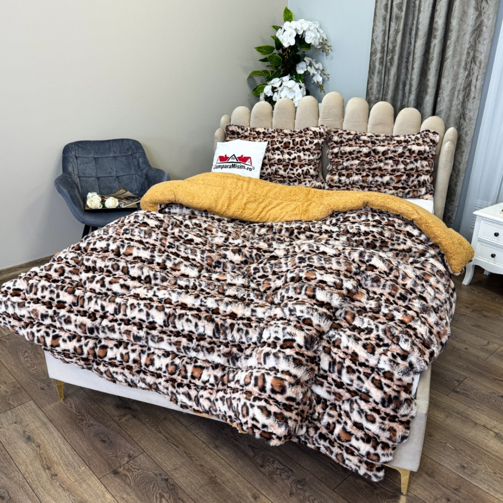 Pilota Groasă cu Fața din Blăniță Artificială de Iepure Dungat și Dos din Blăniță Sherpa, Umplutură Vatelină Siliconică, 200x230 cm + 2 fete de perna 50x70cm - Confort Termic Premium și Eleganță pentru Nopți Racoroase, Bej, Maro, leopard print, Cocolino, cod produs: CSA-PF16
