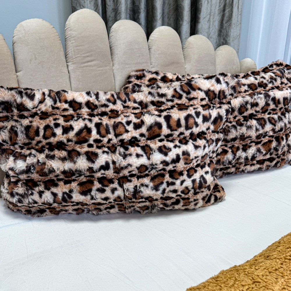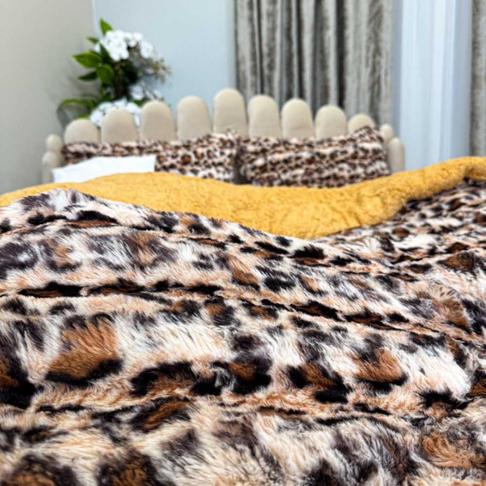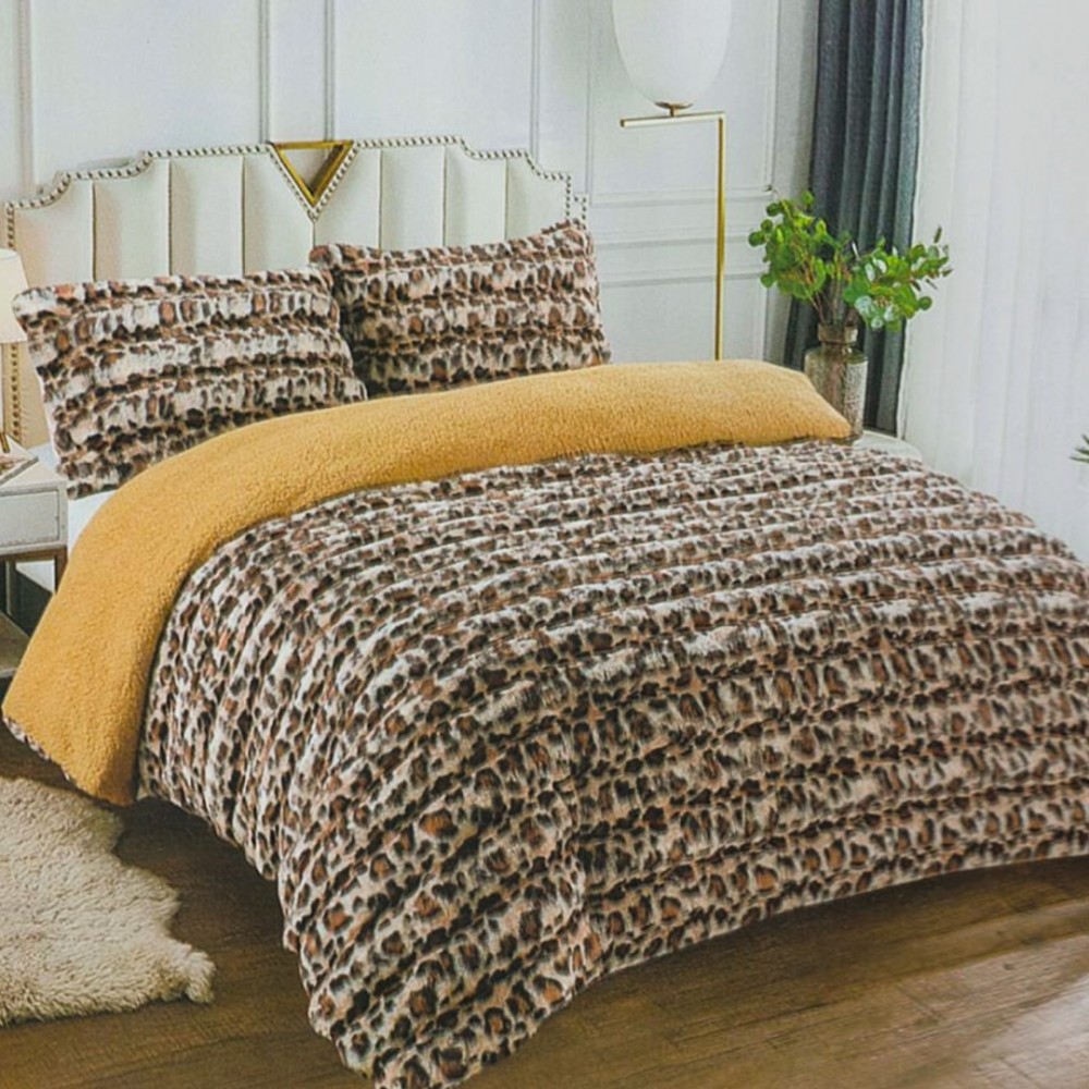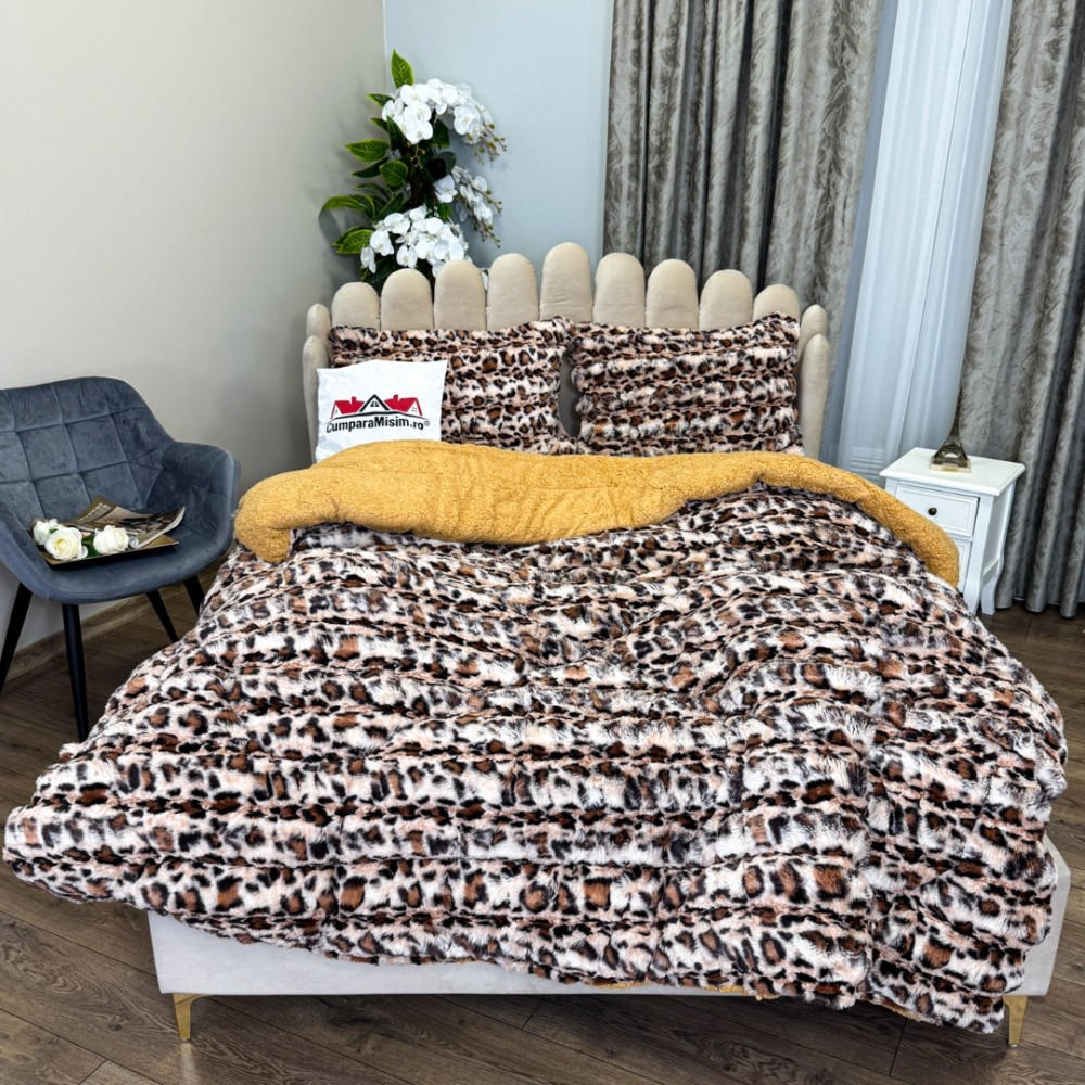 Pilota Groasă cu Fața din Blăniță Artificială de Iepure Dungat și Dos din Blăniță Sherpa, Umplutură Vatelină Siliconică, 200x230 cm + 2 fete de perna 50x70cm - Confort Termic Premium și Eleganță pentru Nopți Racoroase, Bej, Maro, leopard print, Cocolino, cod produs: CSA-PF16
