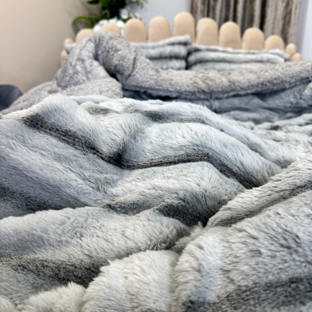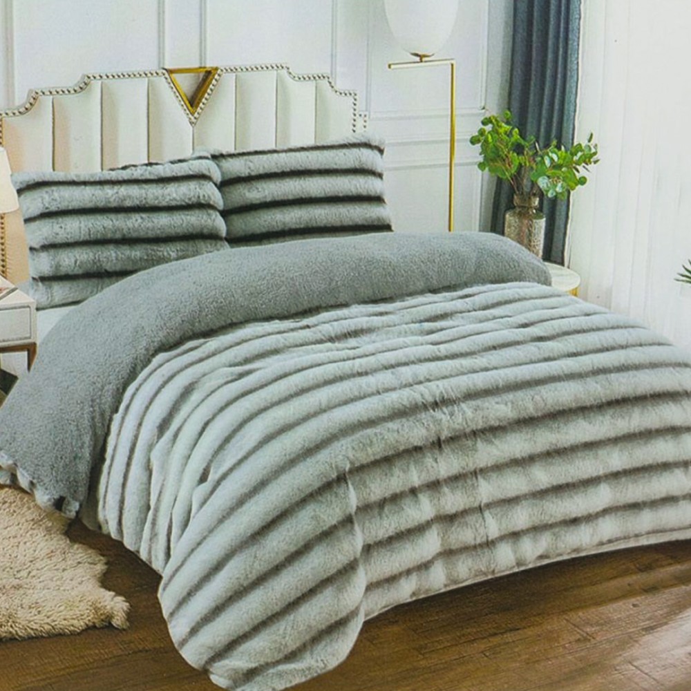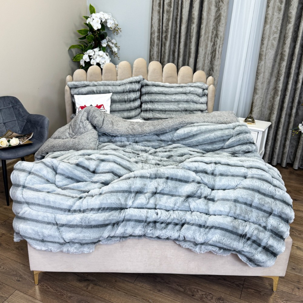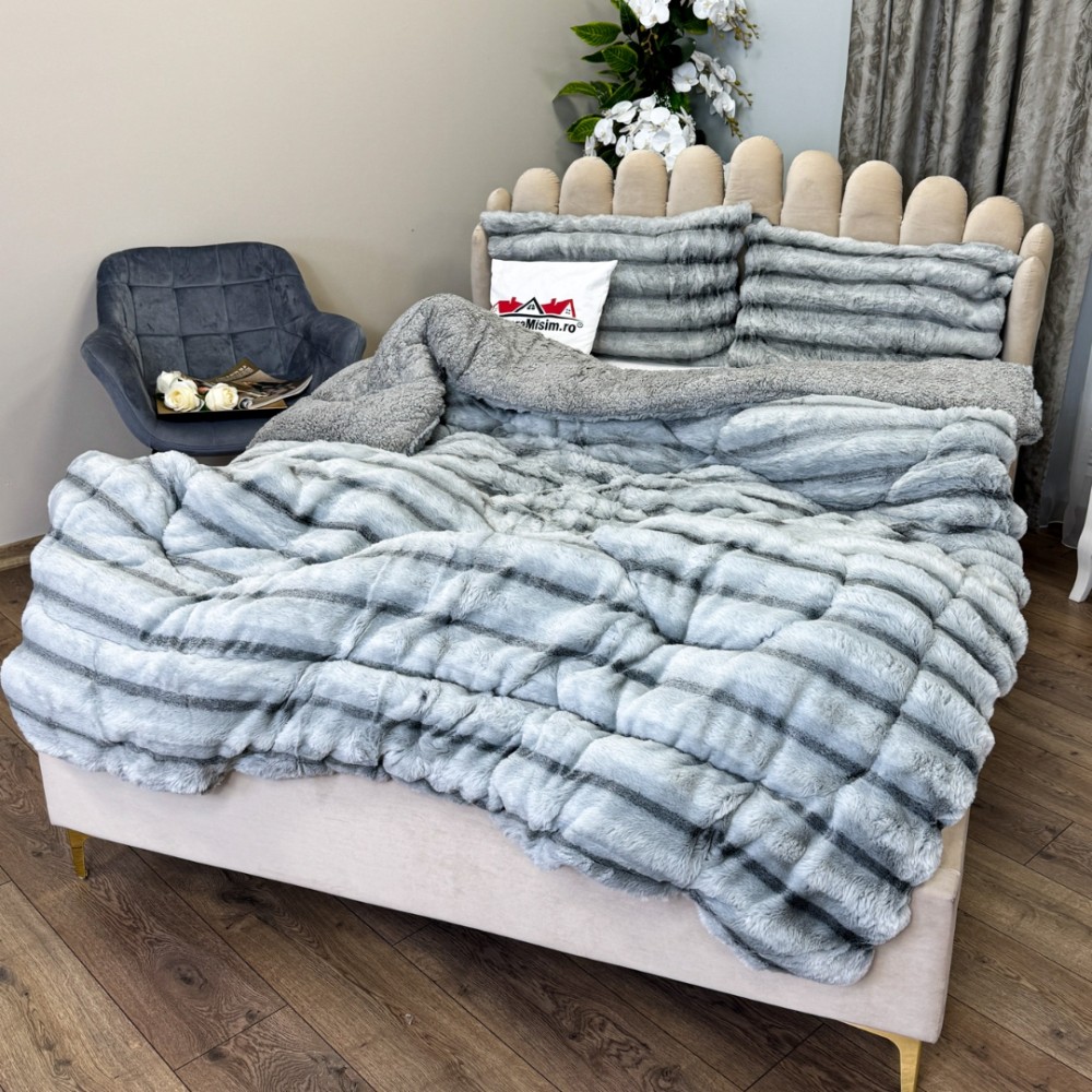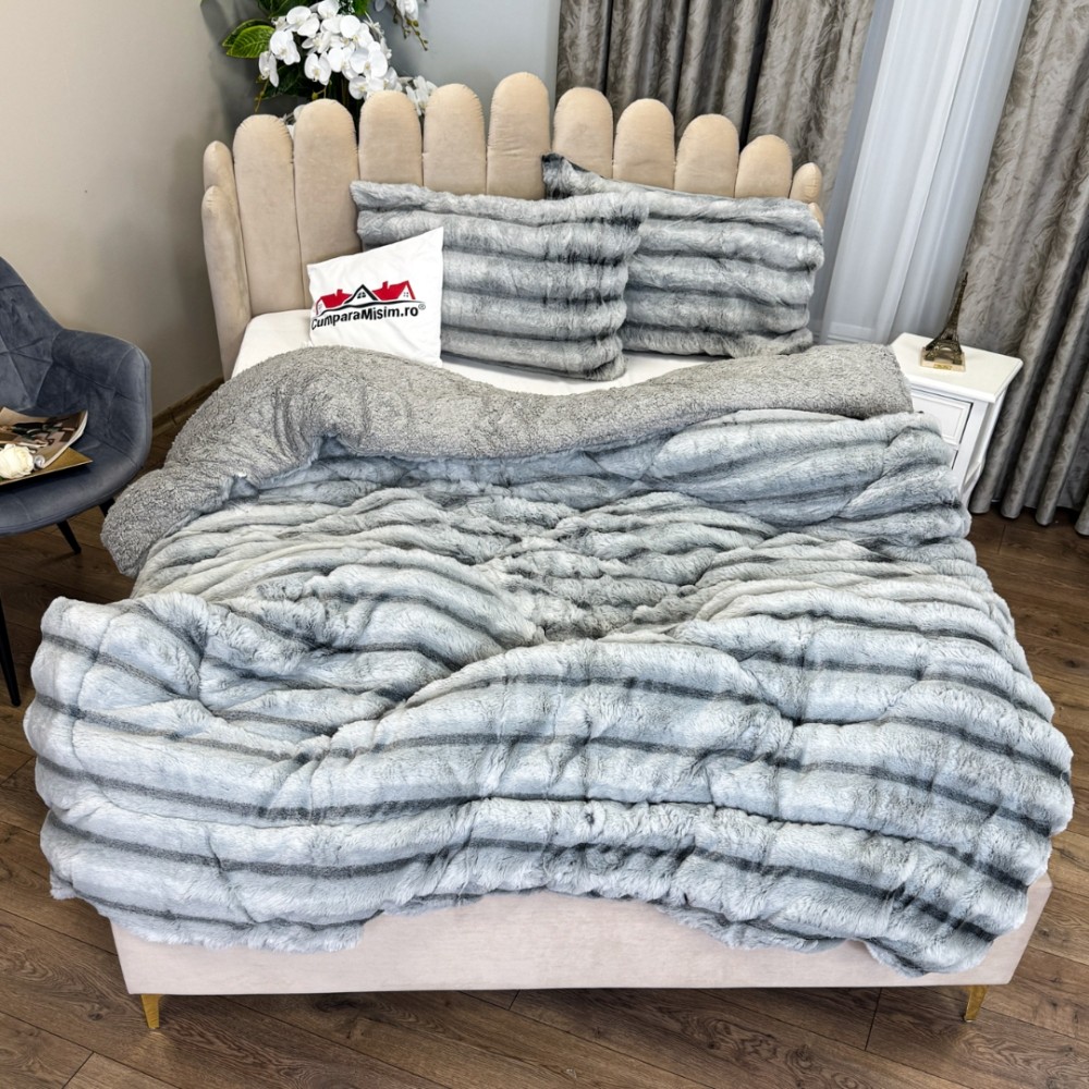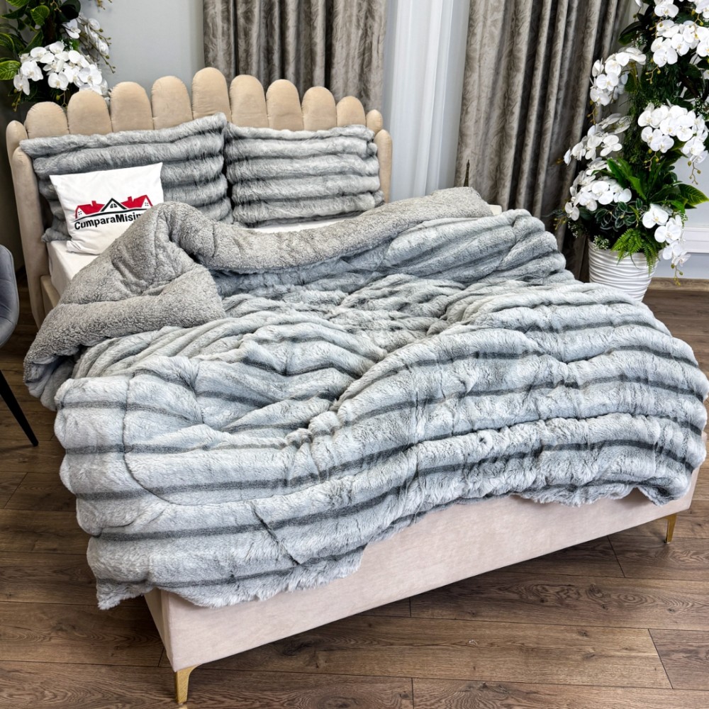 Pilota Groasă cu Fața din Blăniță Artificială de Iepure Dungat și Dos din Blăniță Sherpa, Umplutură Vatelină Siliconică, 200x230 cm + 2 fete de perna 50x70cm - Confort Termic Premium și Eleganță pentru Nopți Racoroase, Gri mediu, Cocolino, cod produs: CSA-PF17