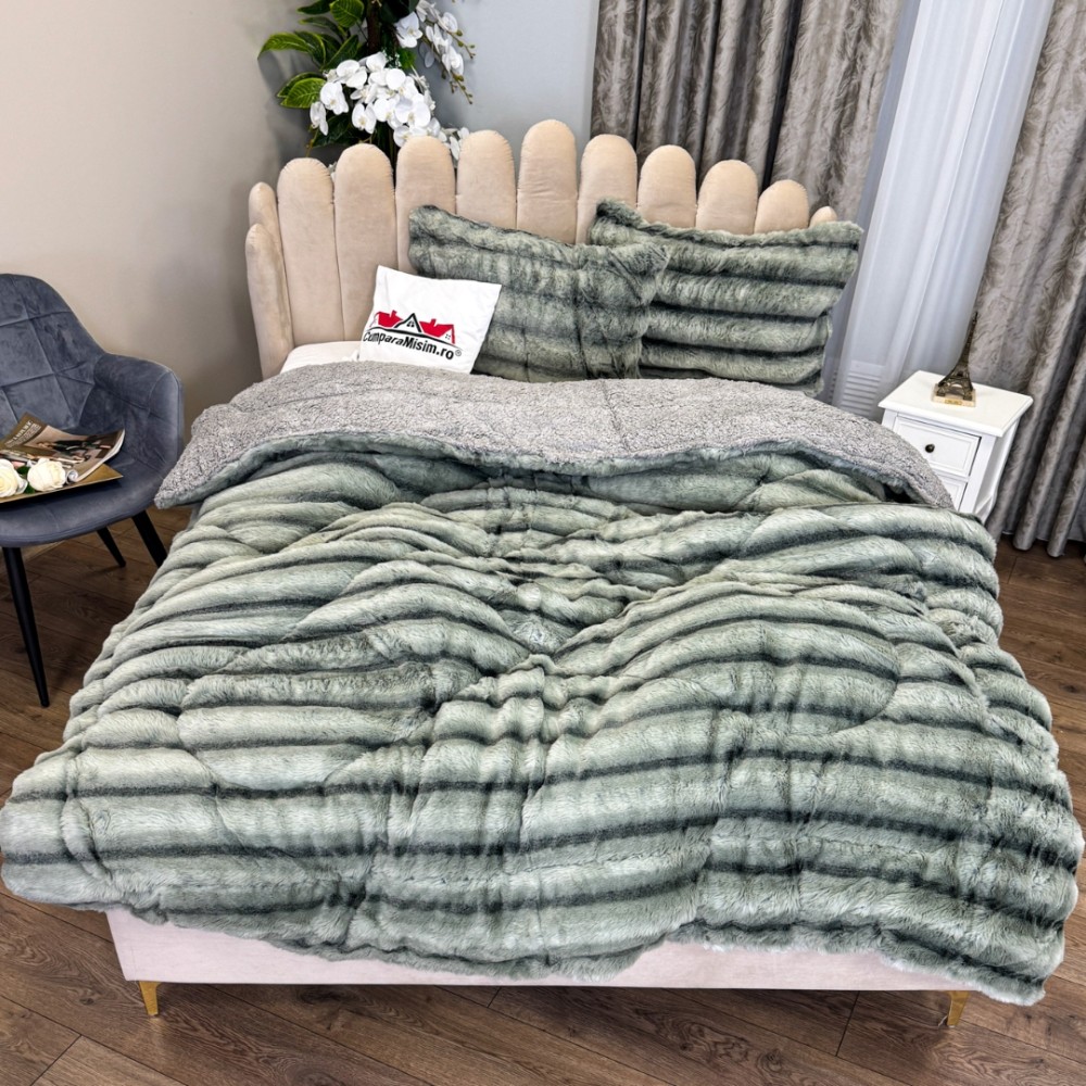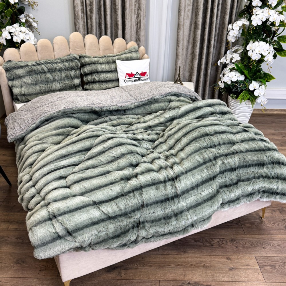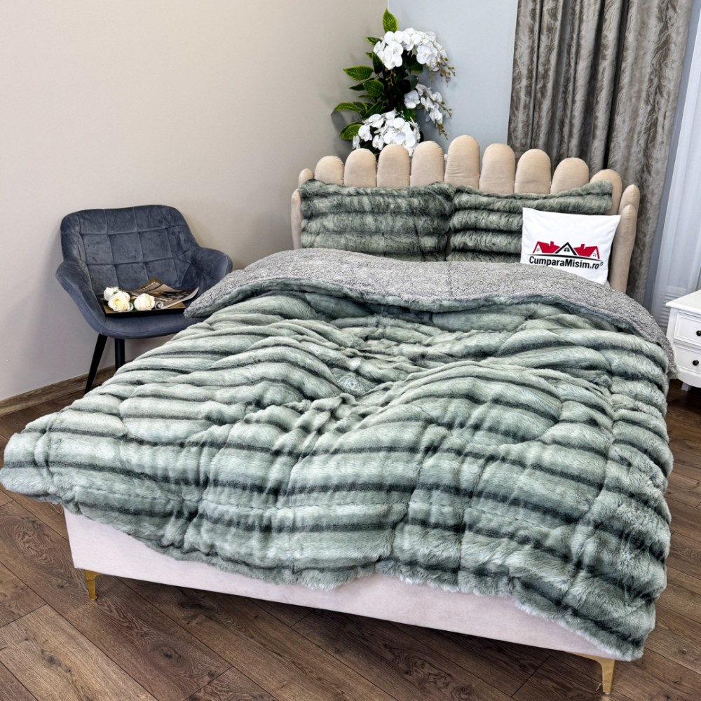 Pilota Groasă cu Fața din Blăniță Artificială de Iepure Dungat și Dos din Blăniță Sherpa, Umplutură Vatelină Siliconică, 200x230 cm + 2 fete de perna 50x70cm - Confort Termic Premium și Eleganță pentru Nopți Racoroase, Menta, Cocolino, cod produs: CSA-PF13