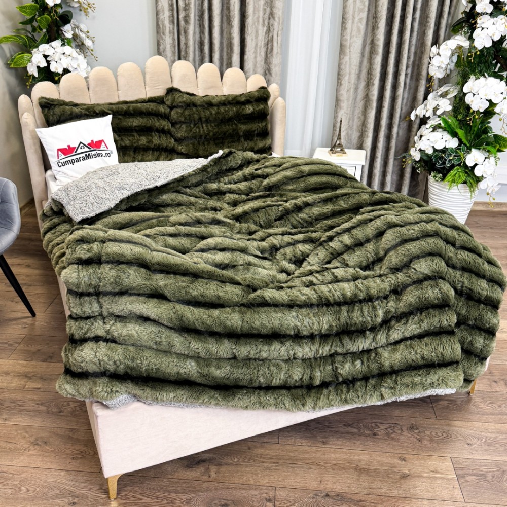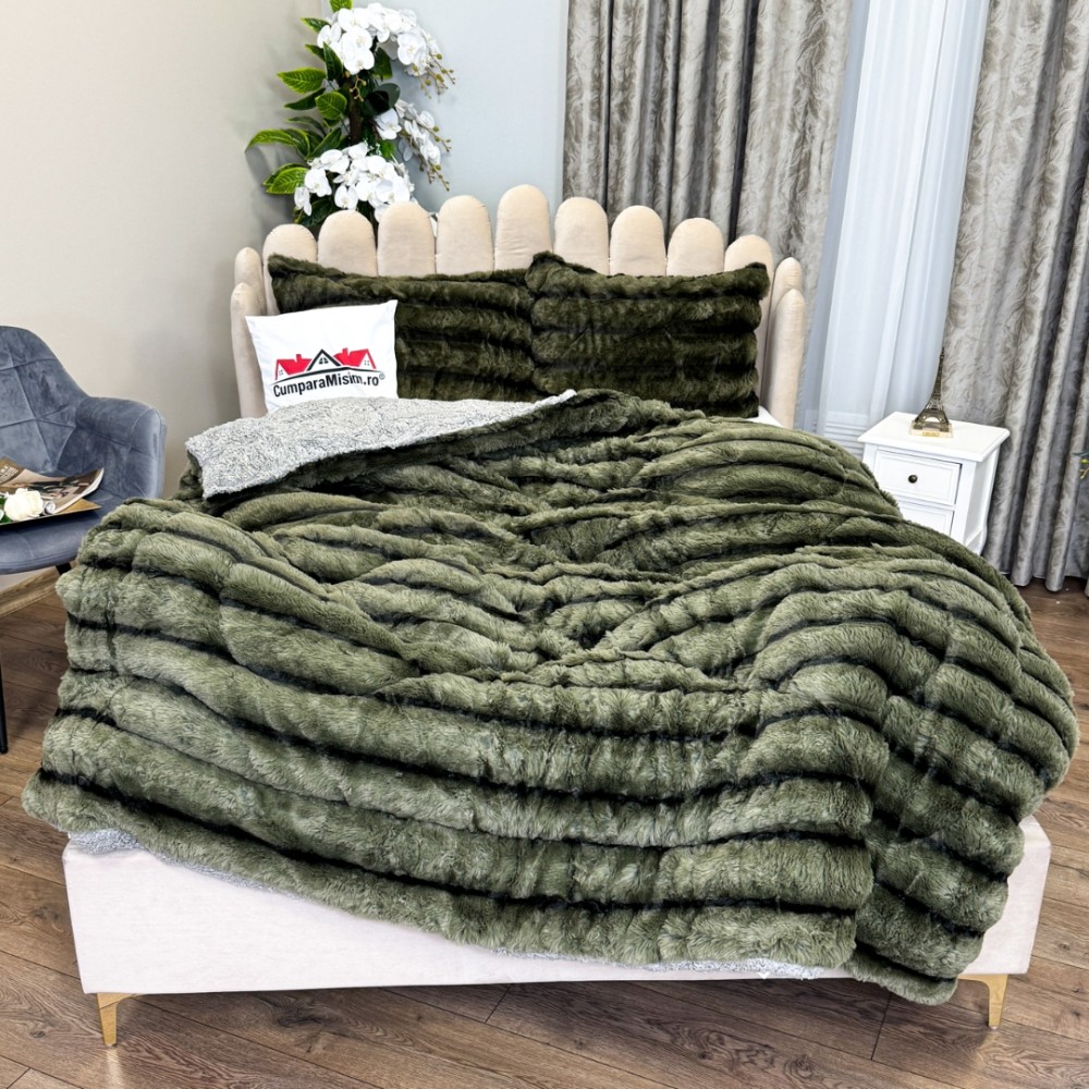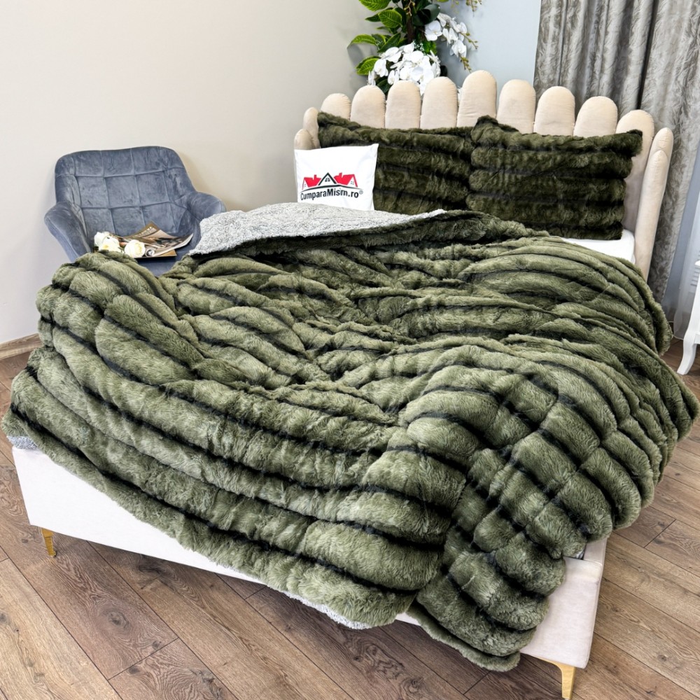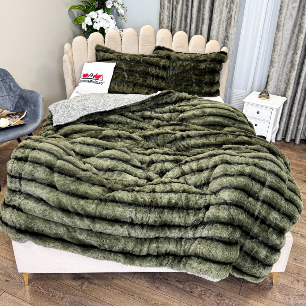 Pilota Groasă cu Fața din Blăniță Artificială de Iepure Dungat și Dos din Blăniță Sherpa, Umplutură Vatelină Siliconică, 200x230 cm + 2 fete de perna 50x70cm - Confort Termic Premium și Eleganță pentru Nopți Racoroase, Verde, Cocolino, cod produs: CSA-PF19