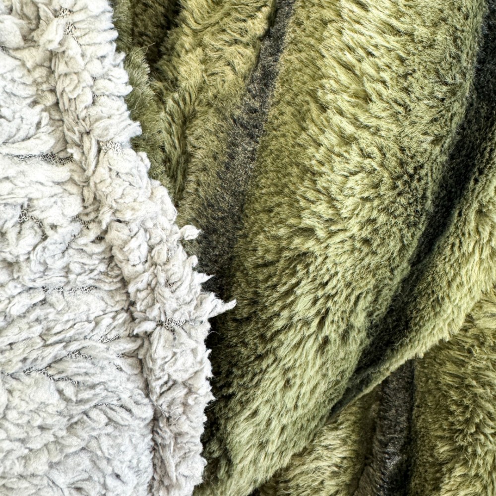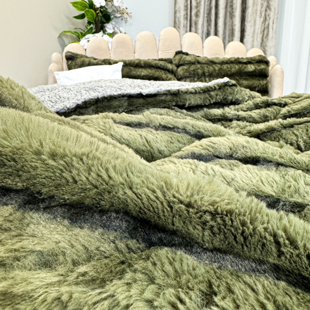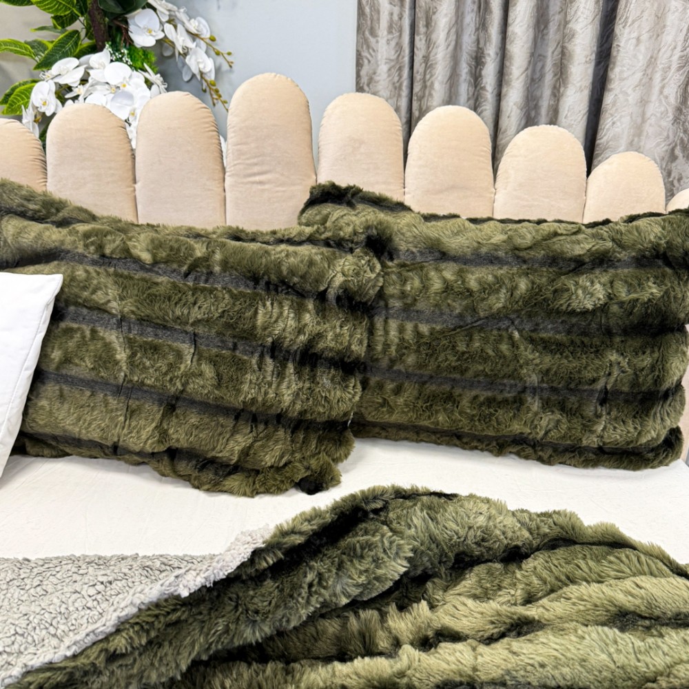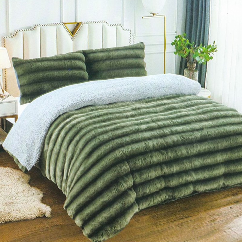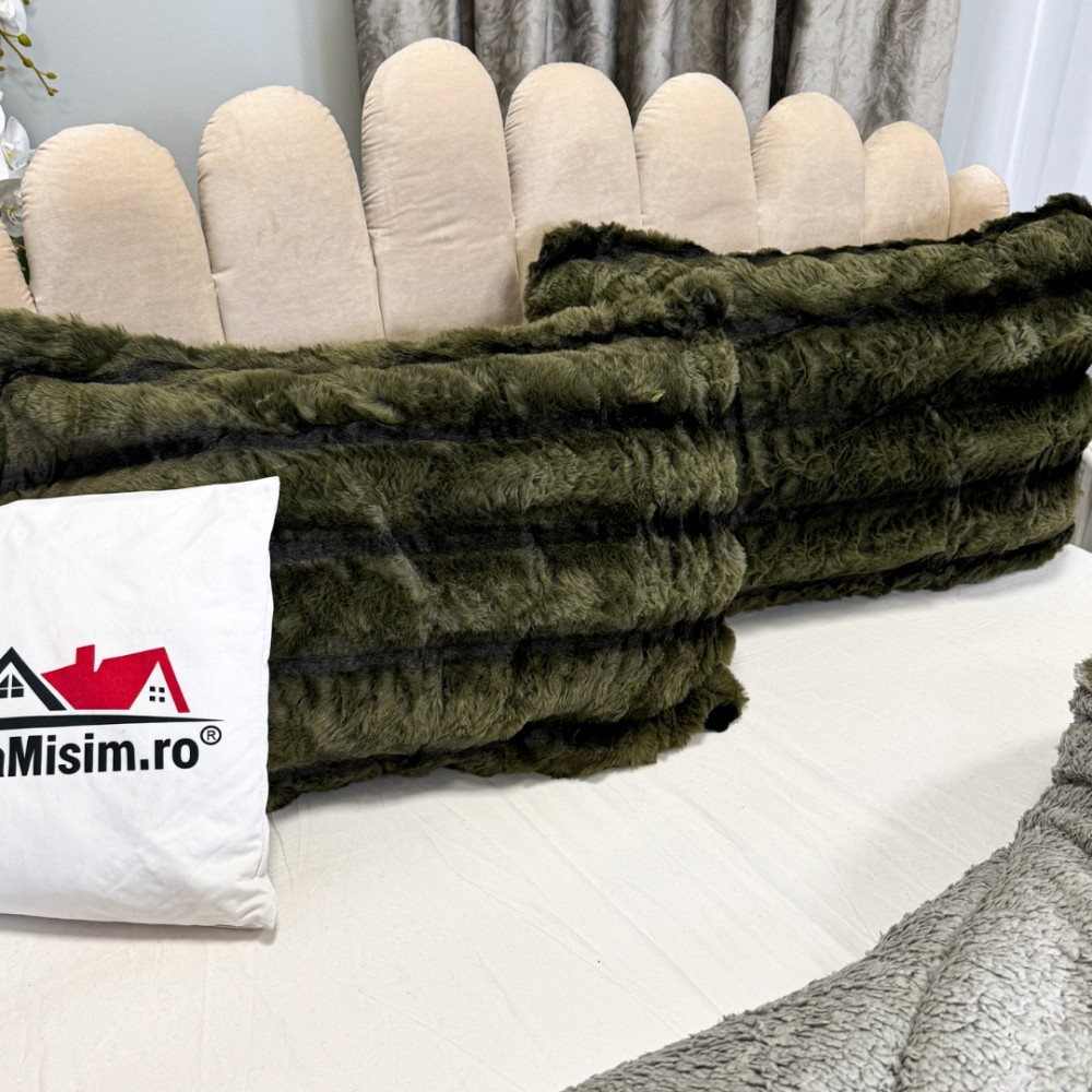 Pilota Groasă cu Fața din Blăniță Artificială de Iepure Dungat și Dos din Blăniță Sherpa, Umplutură Vatelină Siliconică, 200x230 cm + 2 fete de perna 50x70cm - Confort Termic Premium și Eleganță pentru Nopți Racoroase, Verde, Cocolino, cod produs: CSA-PF19