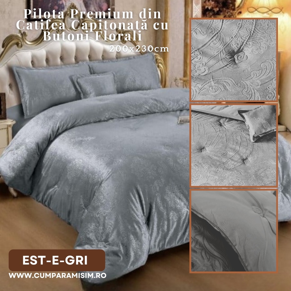 Pilota Premium, 200x230cm, din Catifea Capitonată cu Butoni Florali și Umplutură din Puf Siliconic + 3 Fete de Pernă Incluse, Gri, CumparaMisim, cod produs: EST-E-GRI
