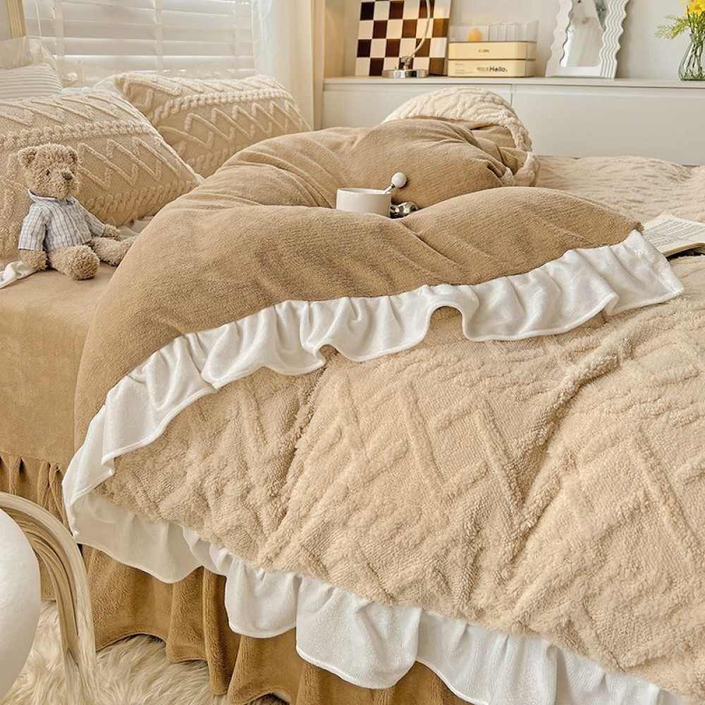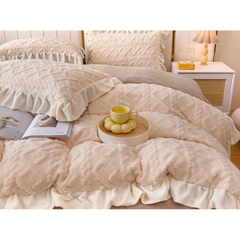 Lenjerie pentru pat dublu pufoasa CoCoLiNo cu VoLaNaSe, tip tricotaj, 4 piese, Bej, cod produs: EXP106