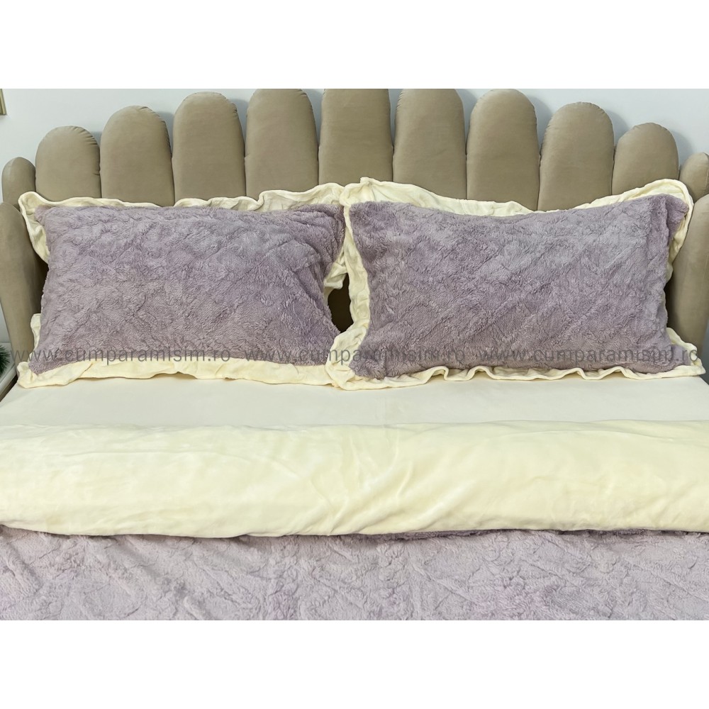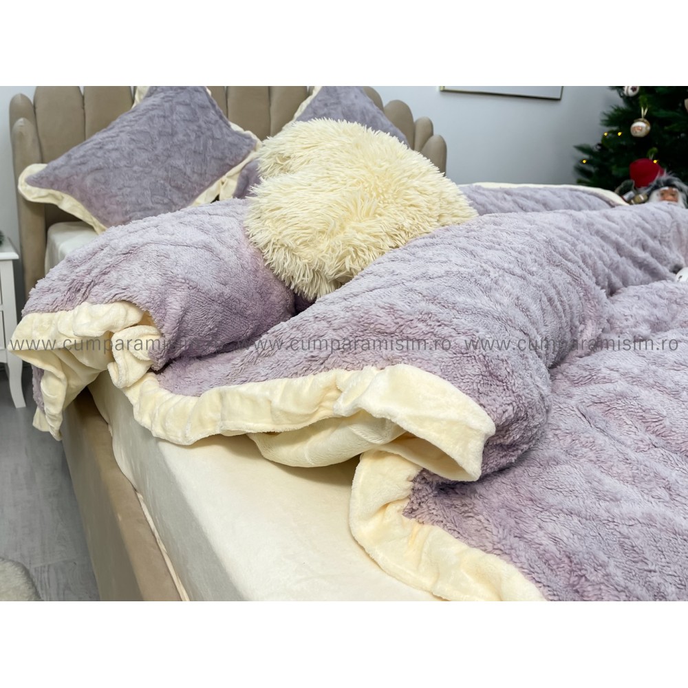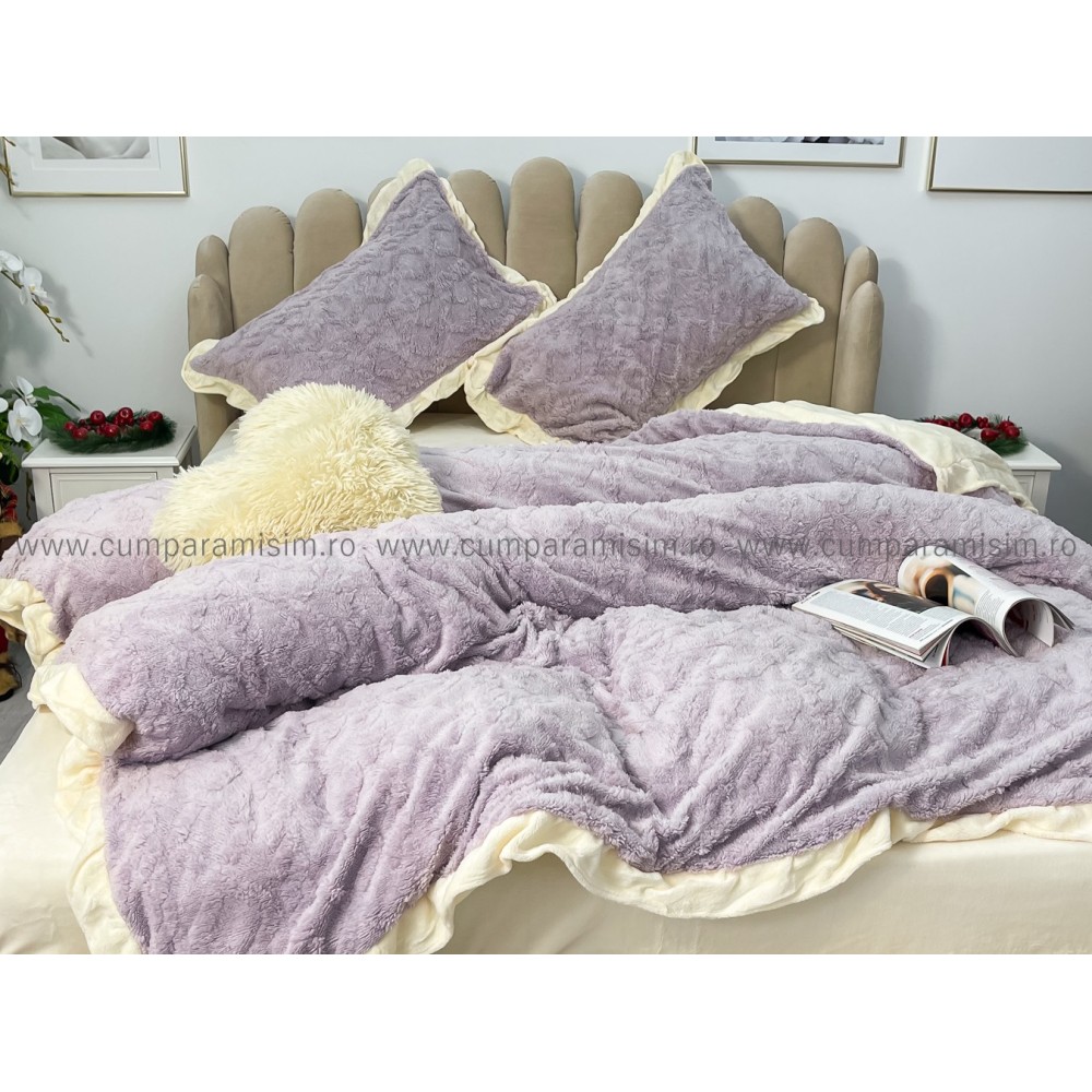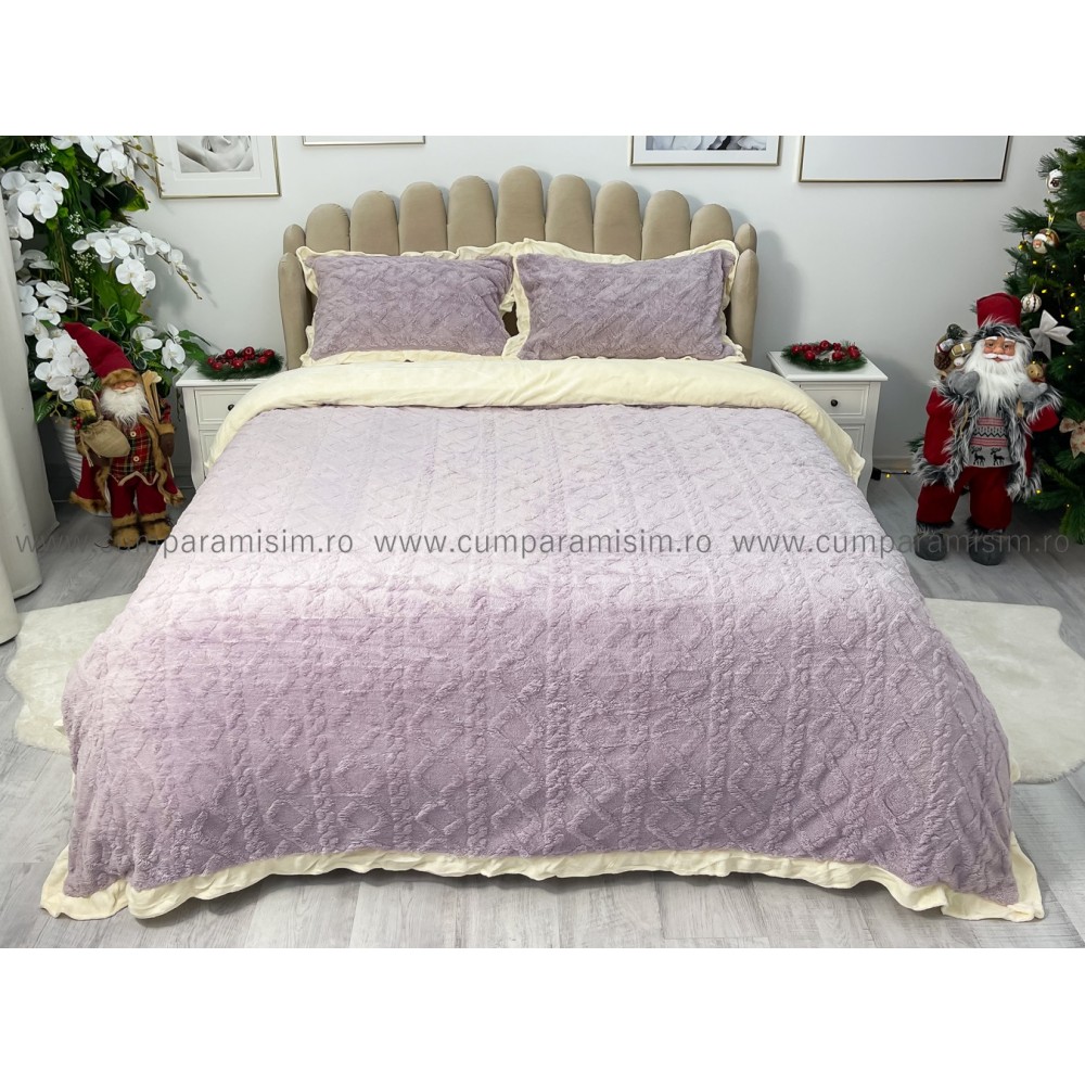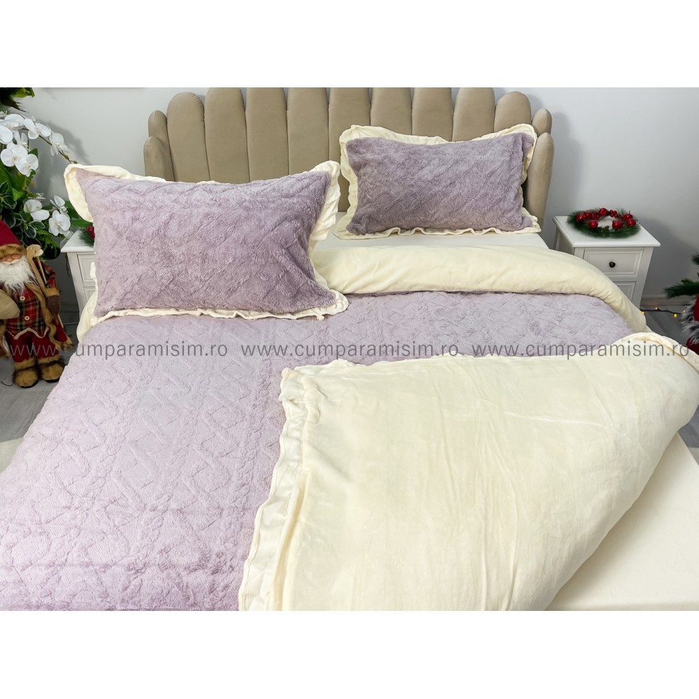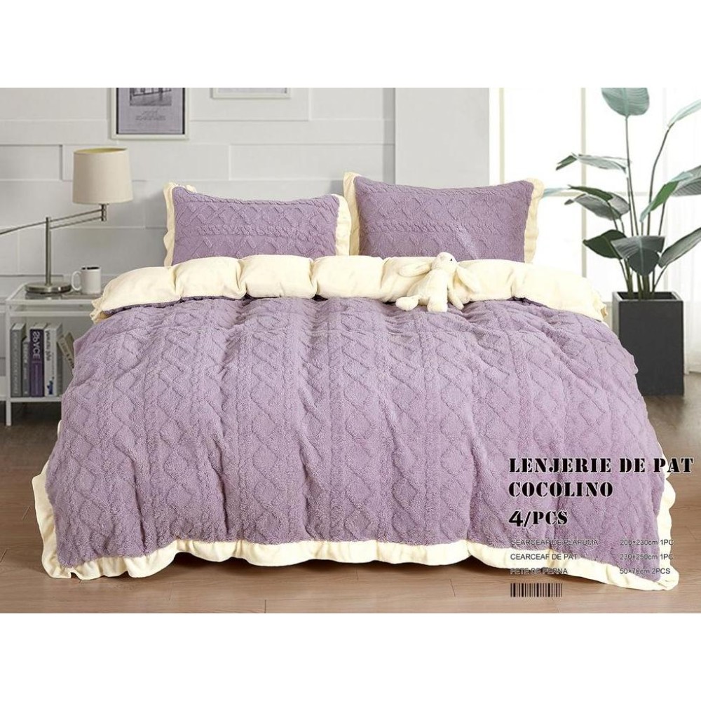 Lenjerie pentru pat dublu pufoasa CoCoLiNo cu VoLaNaSe, tip tricotaj, 4 piese, Lila, cod produs: EXP102