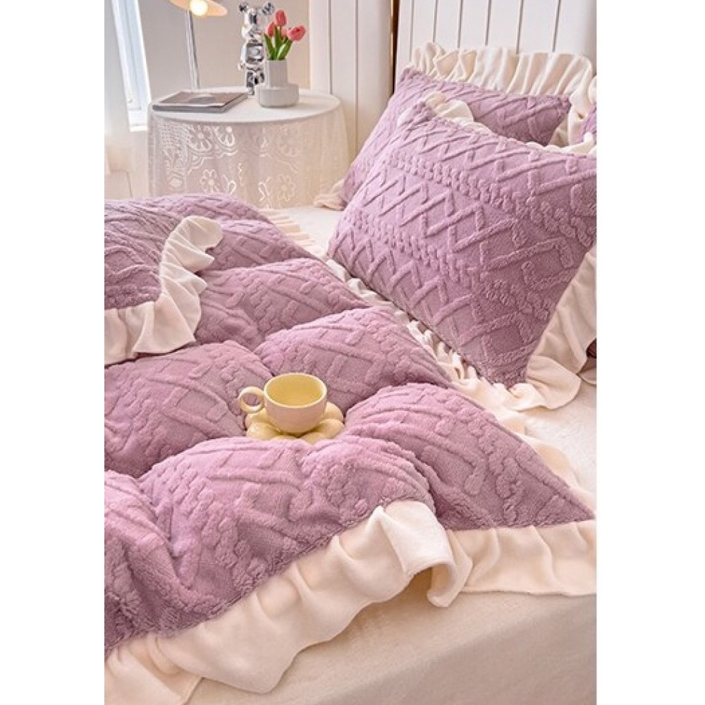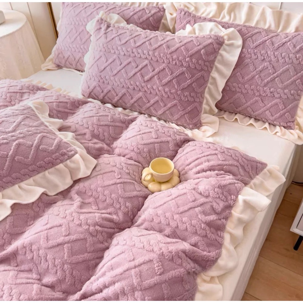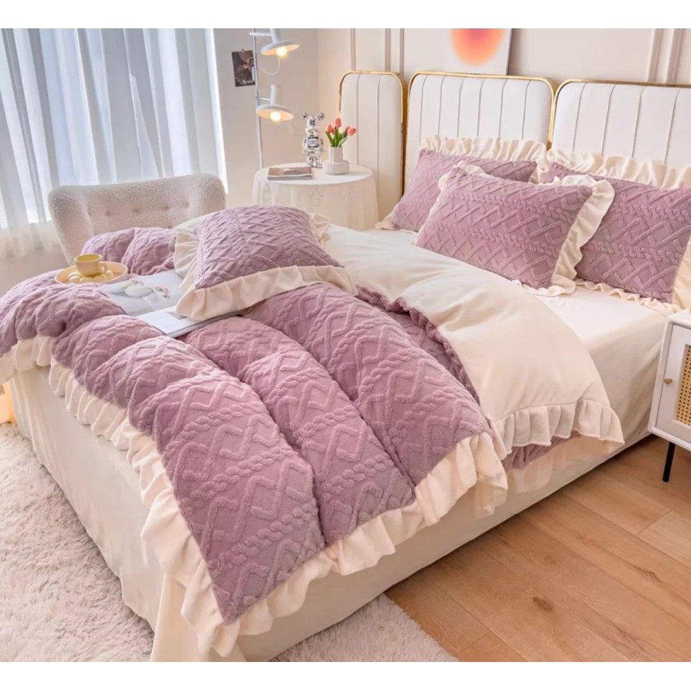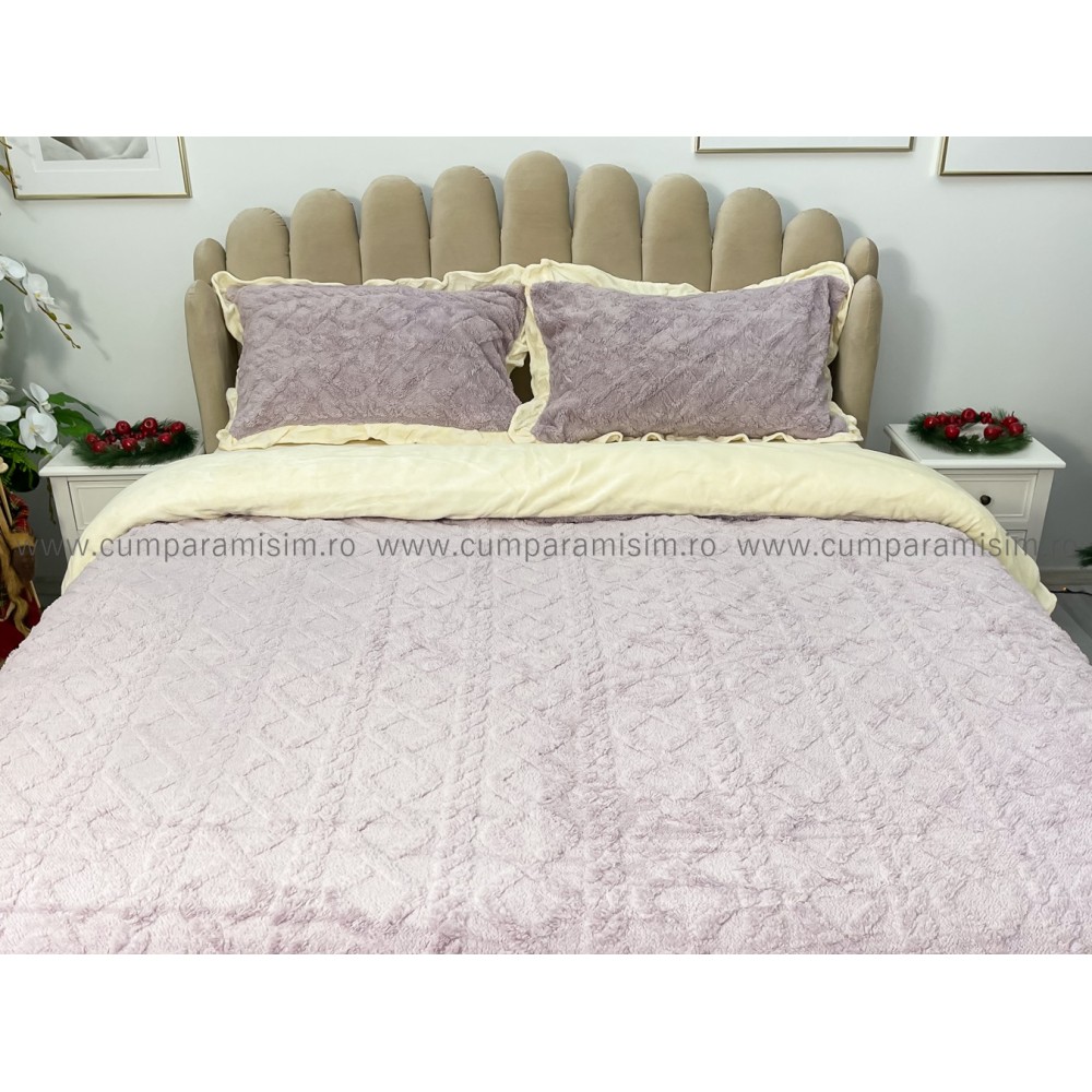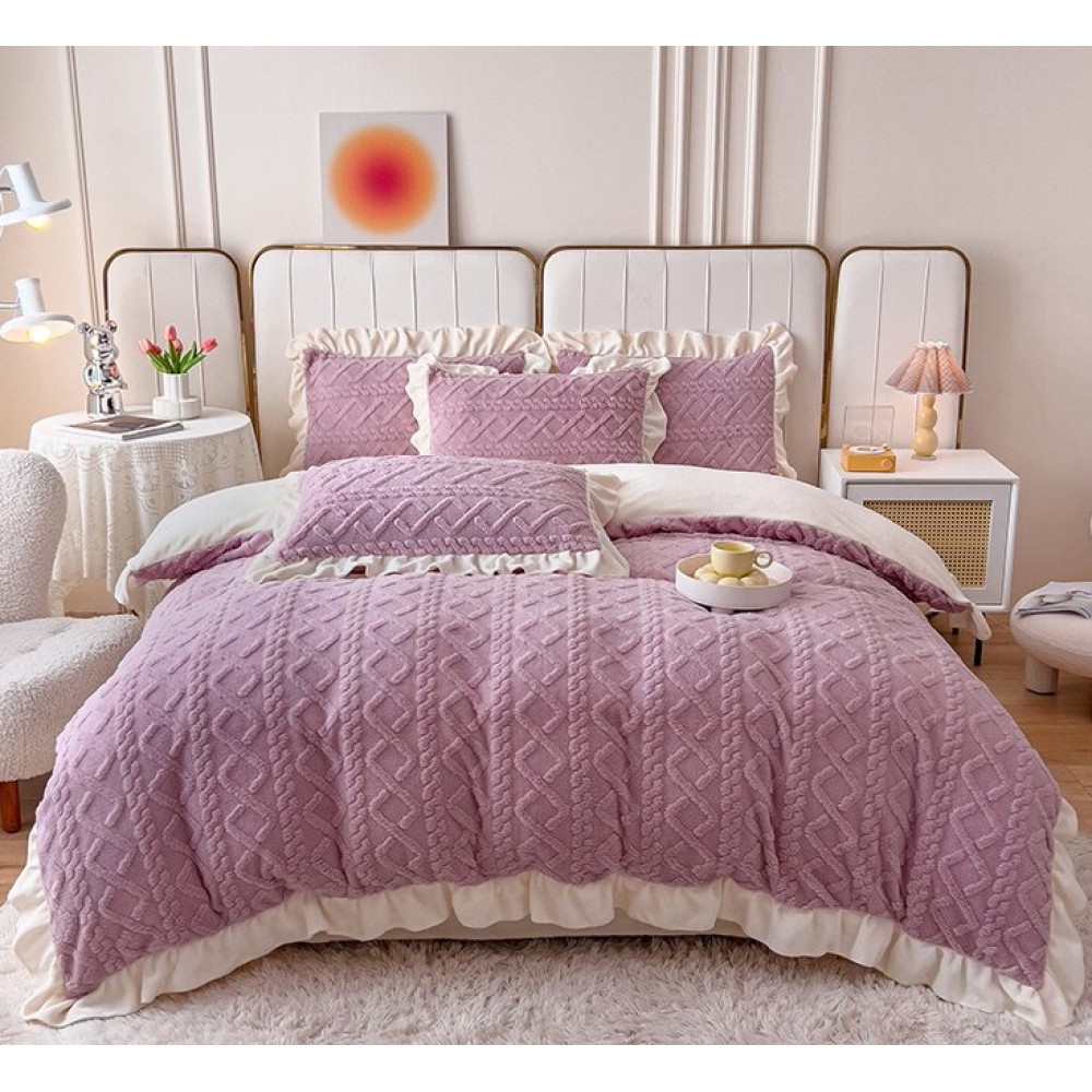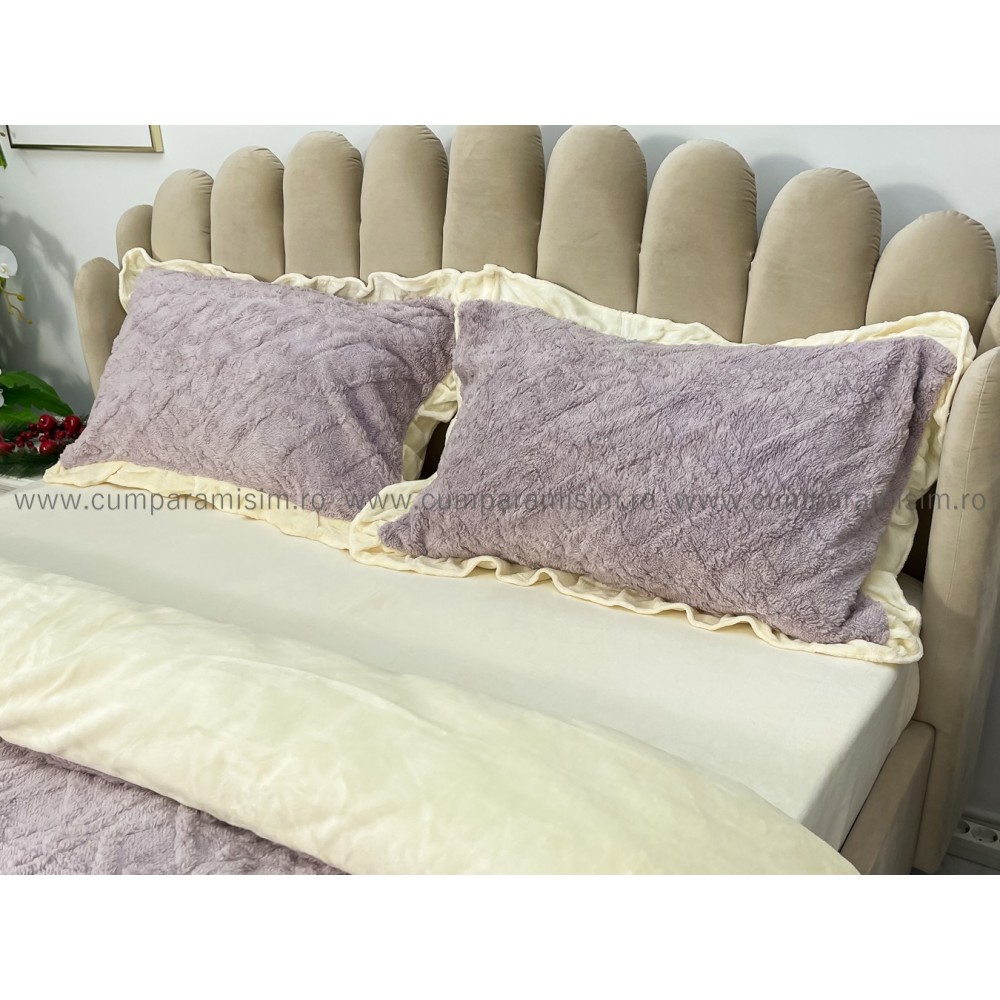 Lenjerie pentru pat dublu pufoasa CoCoLiNo cu VoLaNaSe, tip tricotaj, 4 piese, Lila, cod produs: EXP102