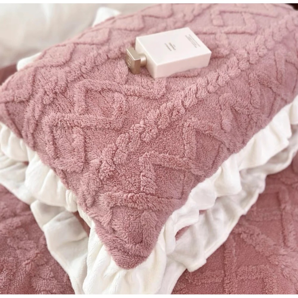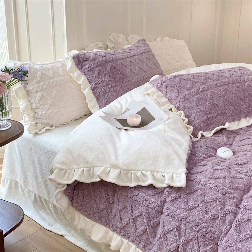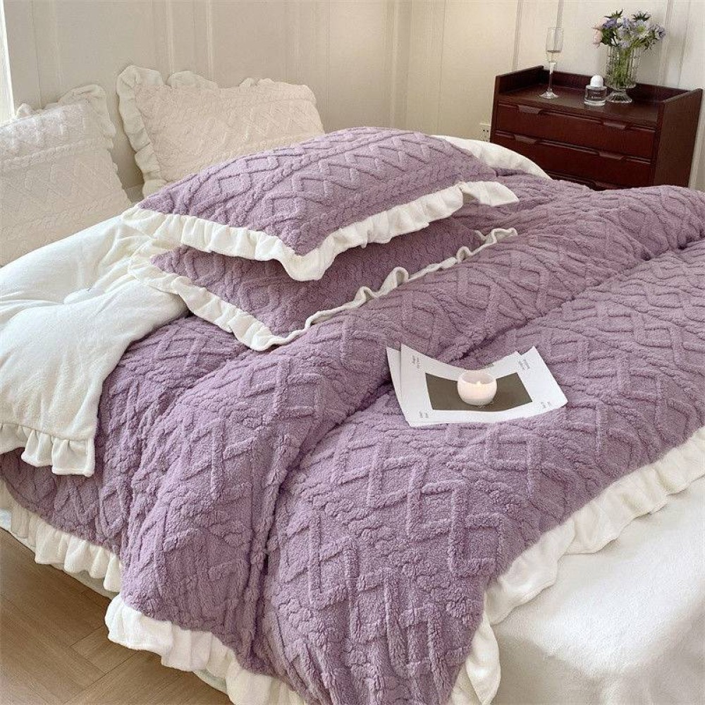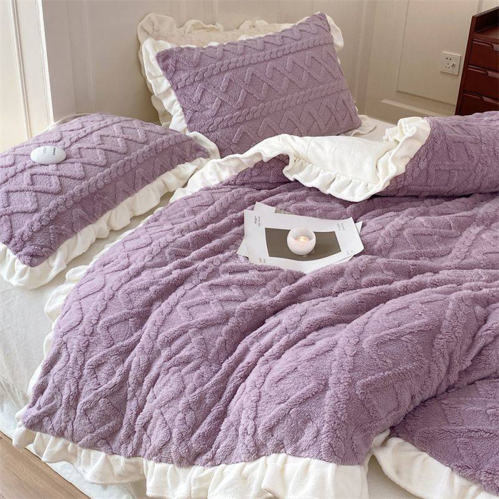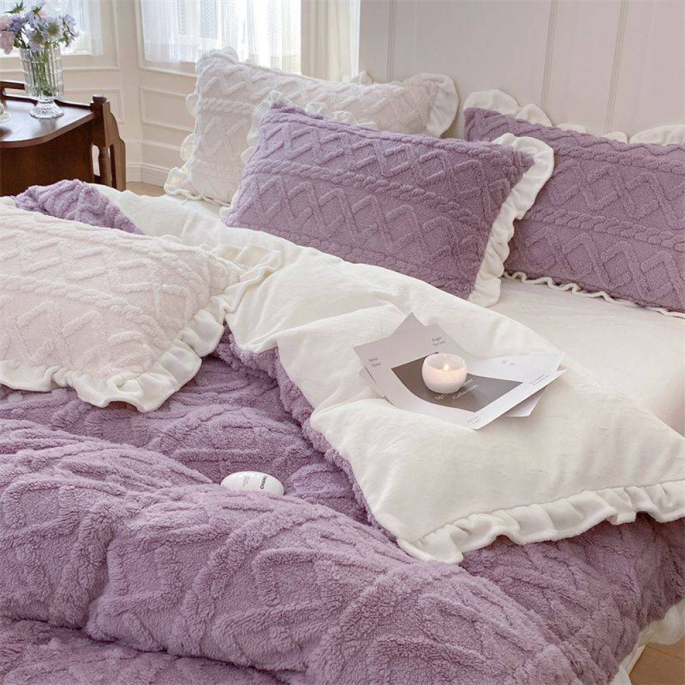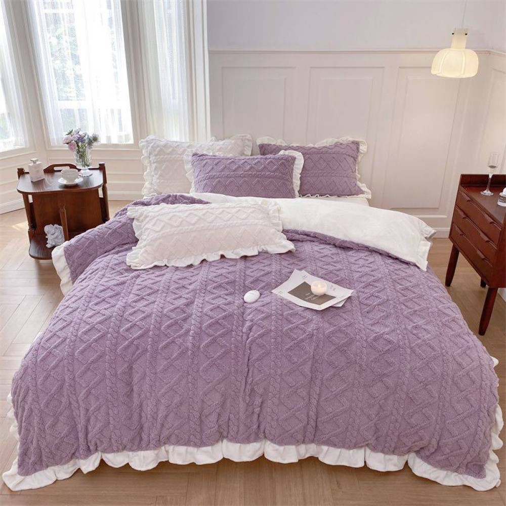 Lenjerie pentru pat dublu pufoasa CoCoLiNo cu VoLaNaSe, tip tricotaj, 4 piese, Lila, cod produs: EXP102