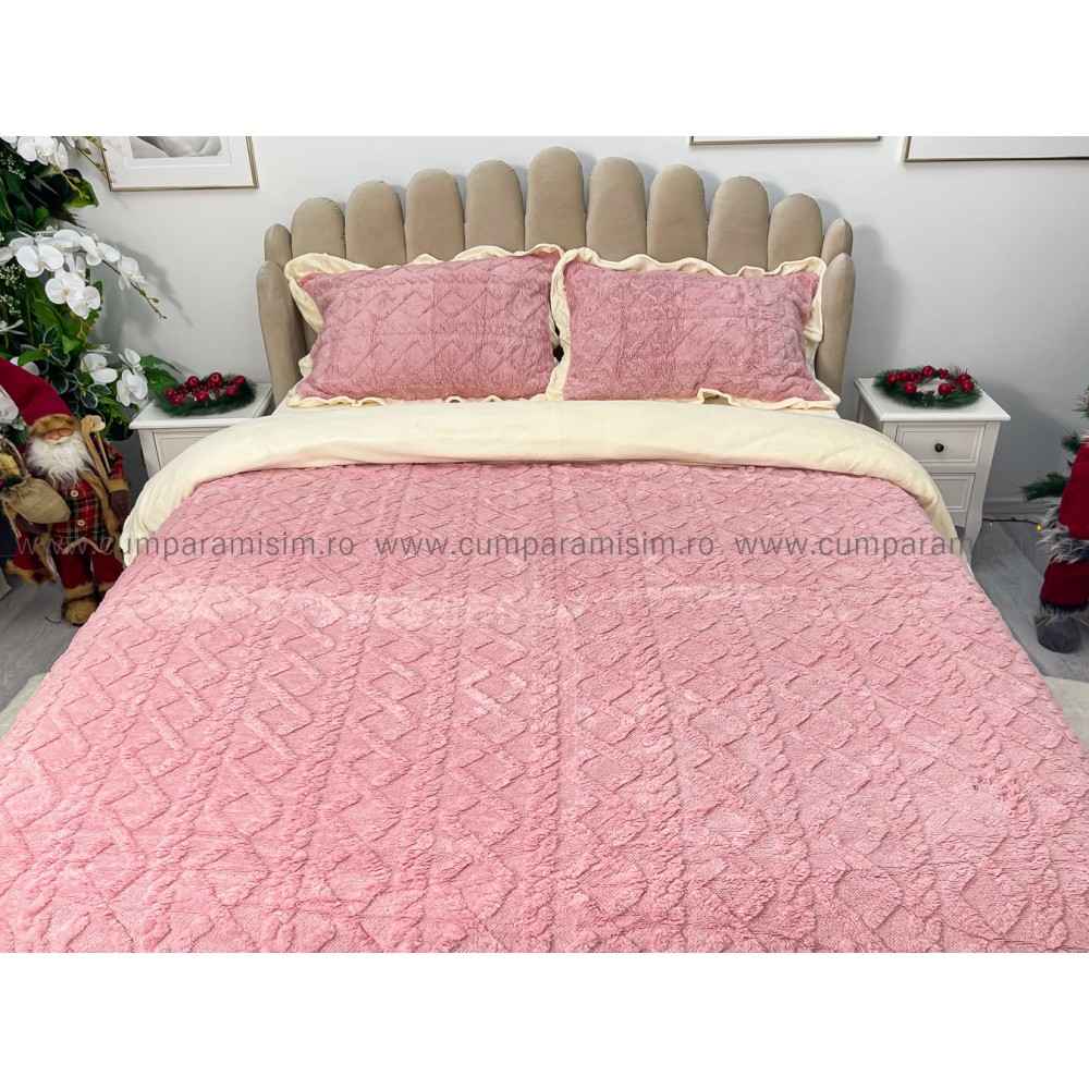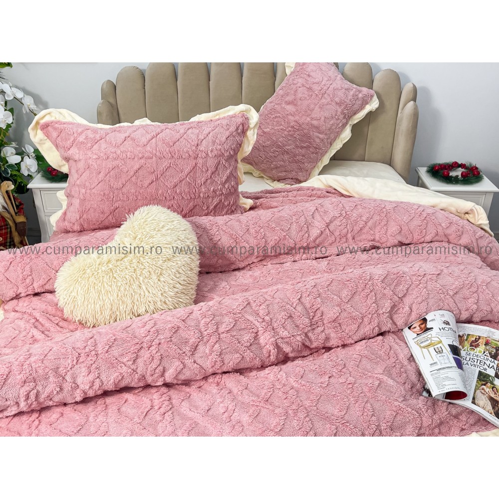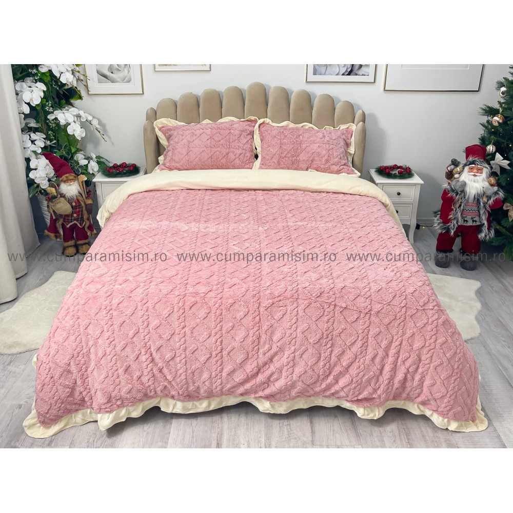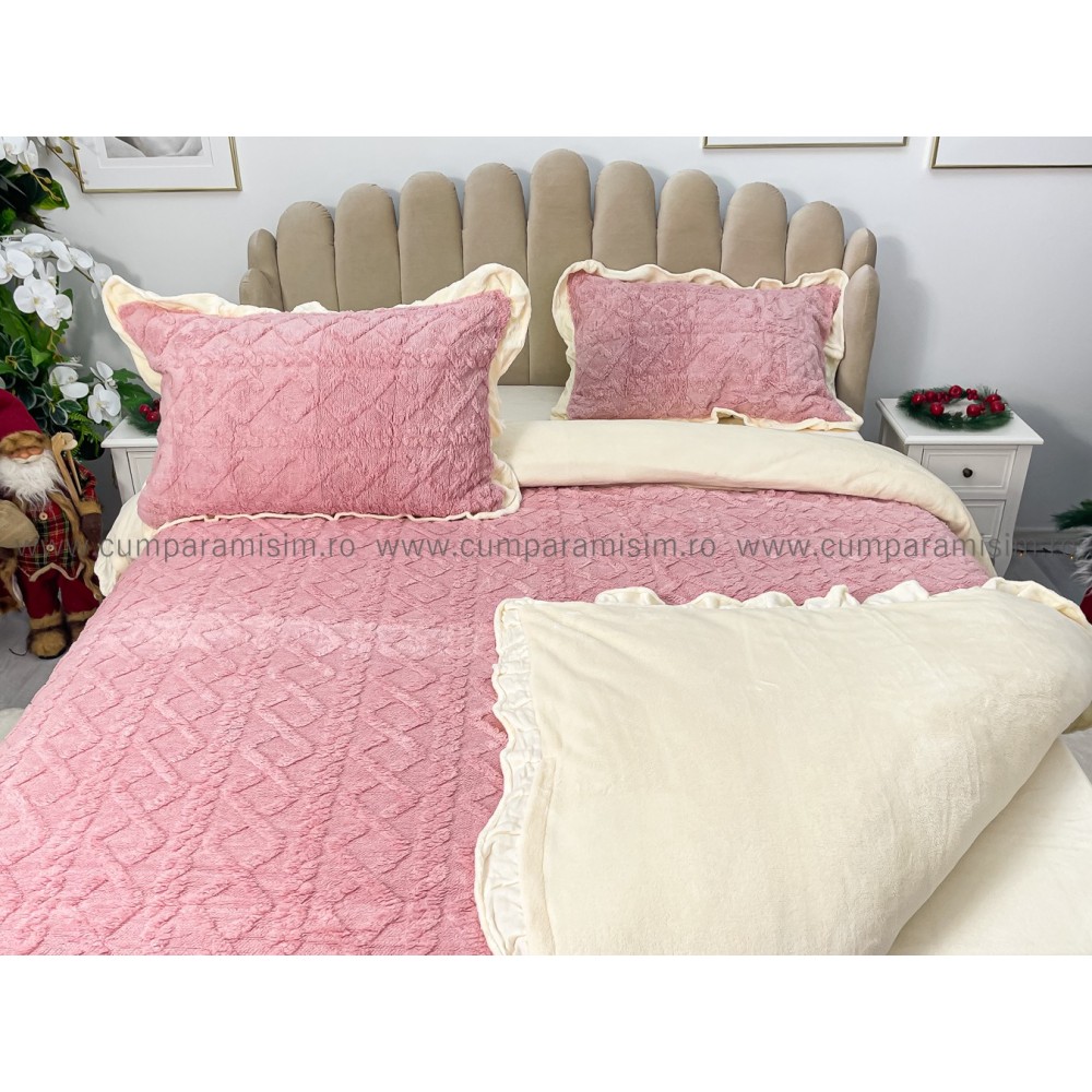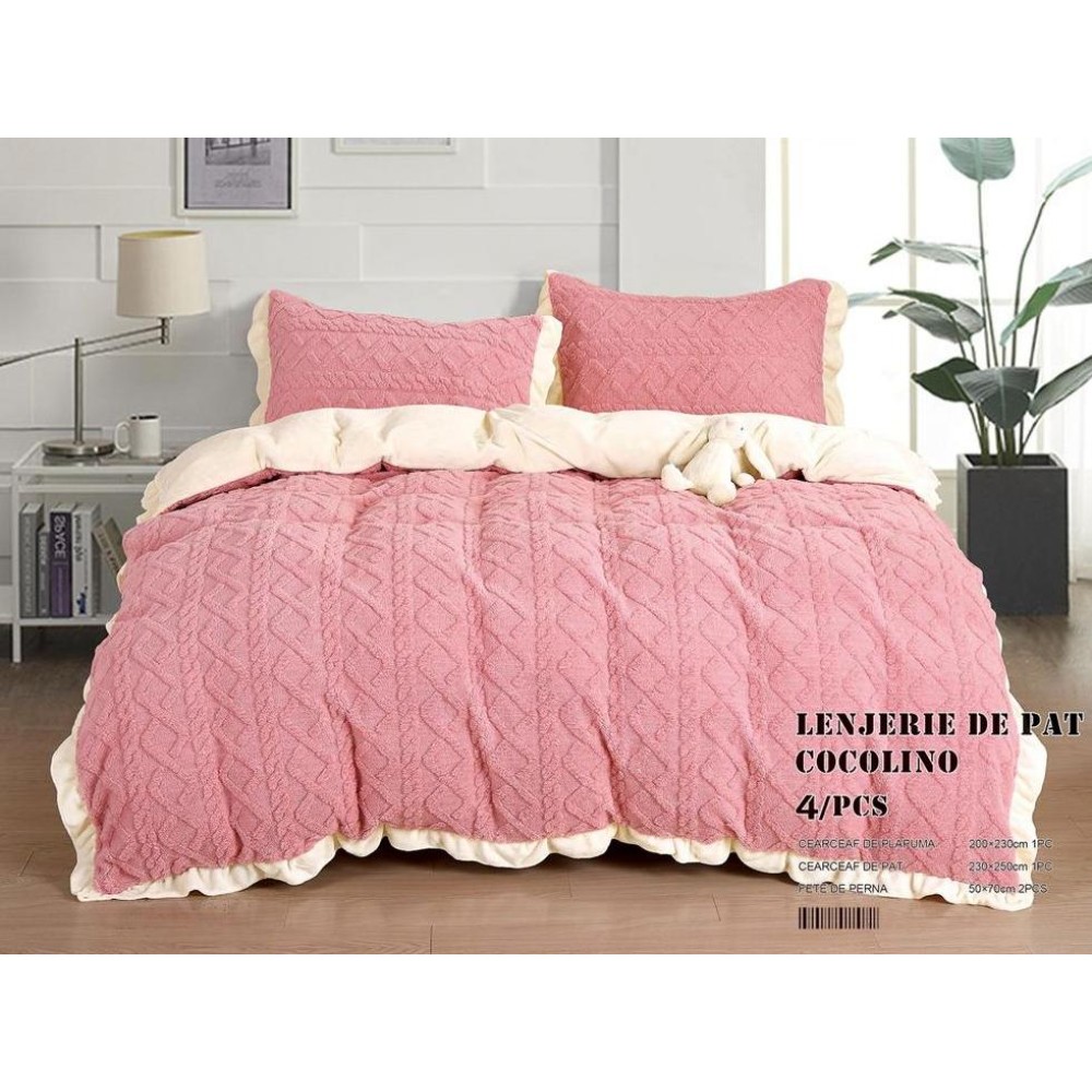 Lenjerie pentru pat dublu pufoasa CoCoLiNo cu VoLaNaSe, tip tricotaj, 4 piese, Roz, cod produs: EXP108
