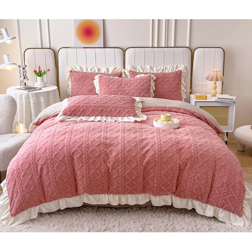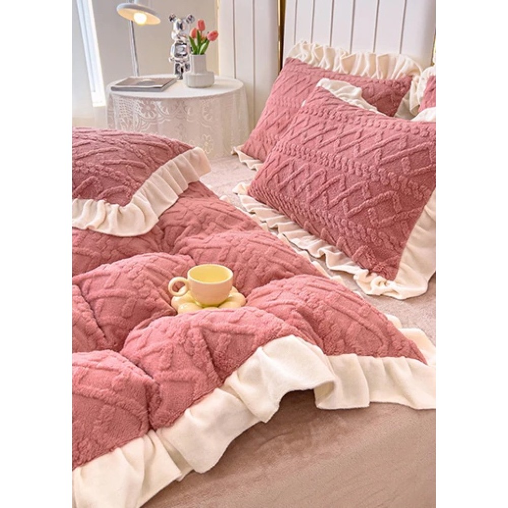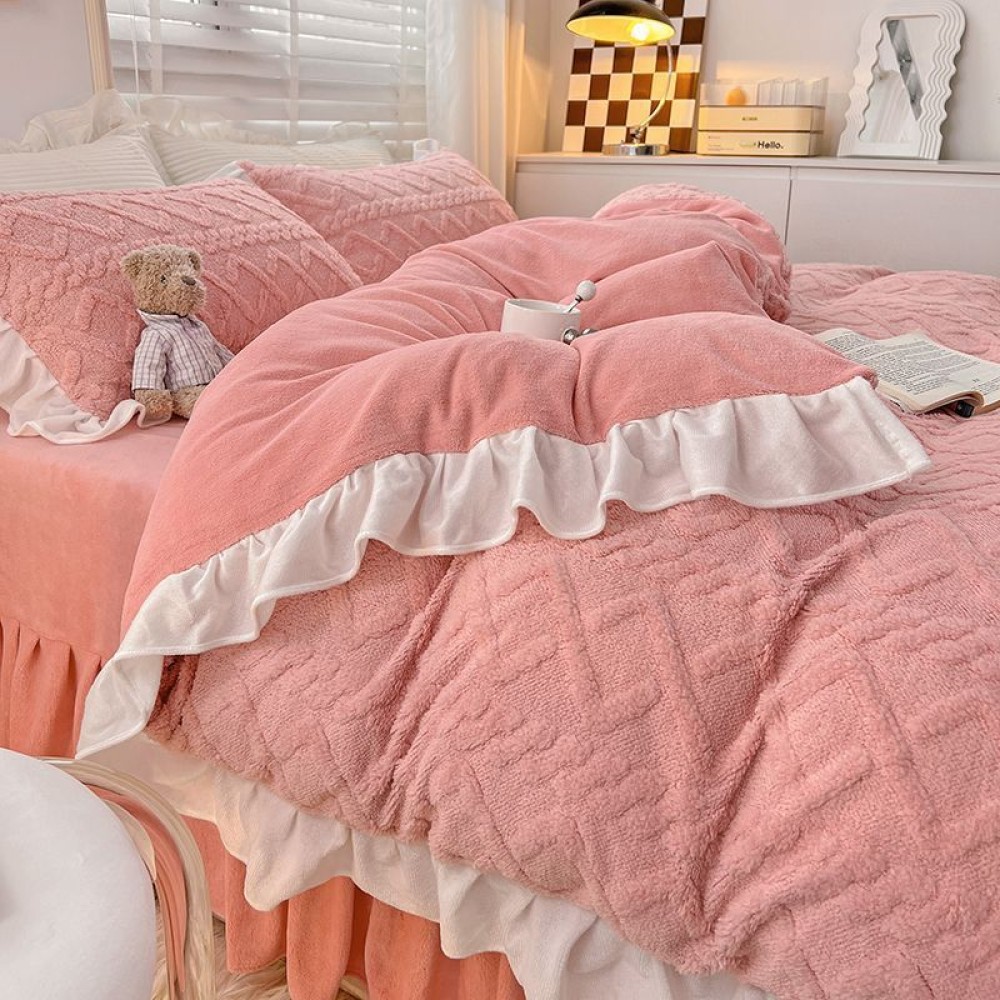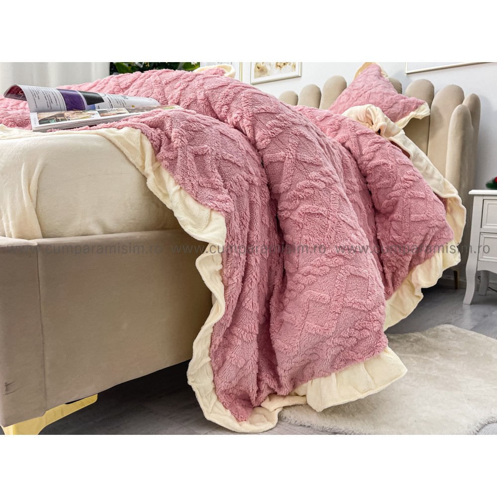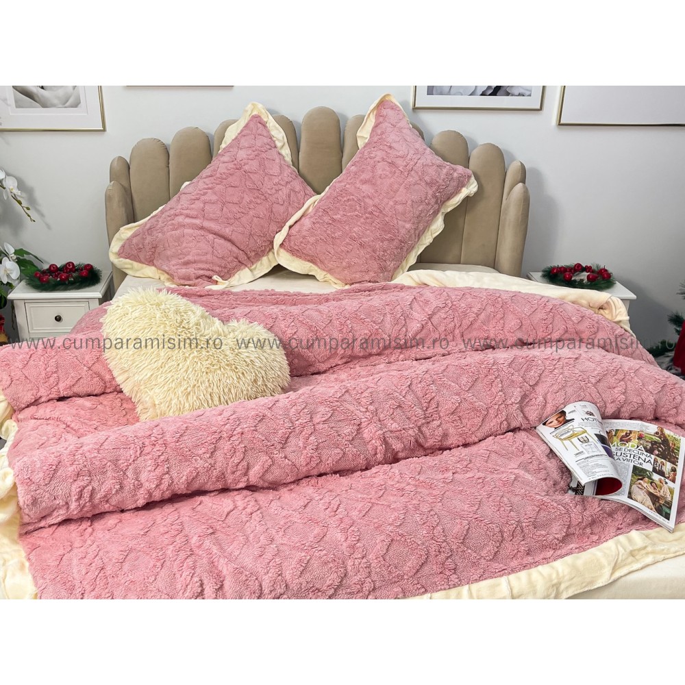 Lenjerie pentru pat dublu pufoasa CoCoLiNo cu VoLaNaSe, tip tricotaj, 4 piese, Roz, cod produs: EXP108
