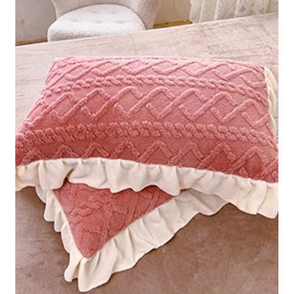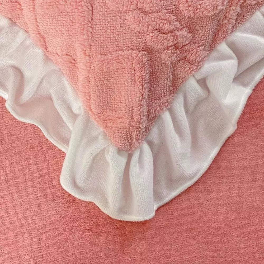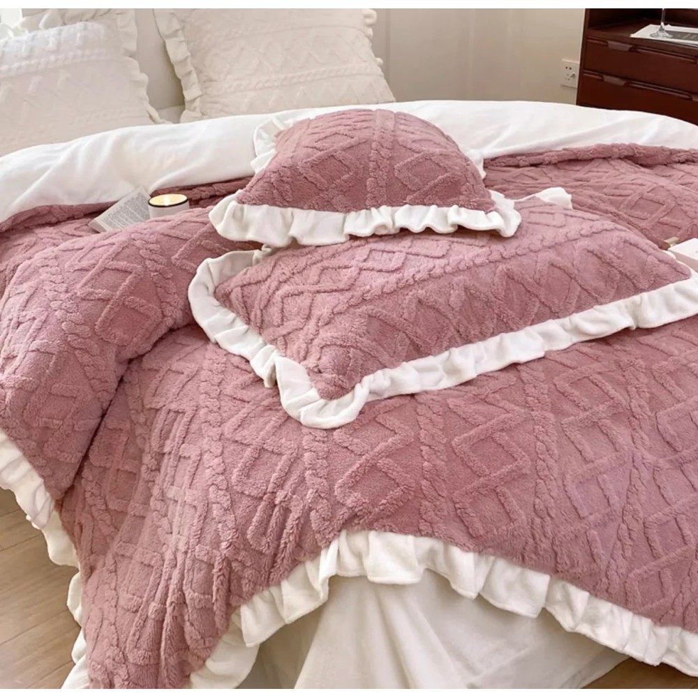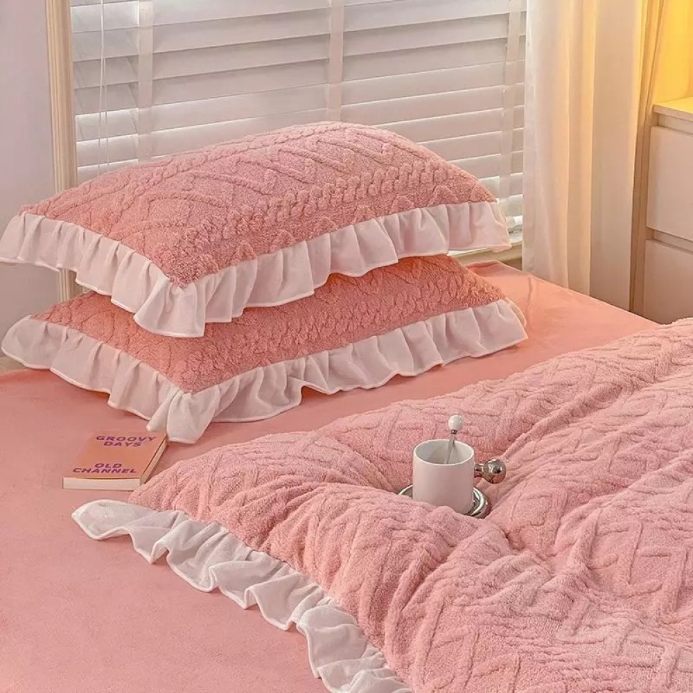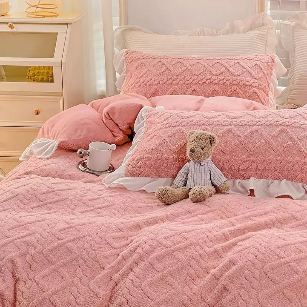 Lenjerie pentru pat dublu pufoasa CoCoLiNo cu VoLaNaSe, tip tricotaj, 4 piese, Roz, cod produs: EXP108