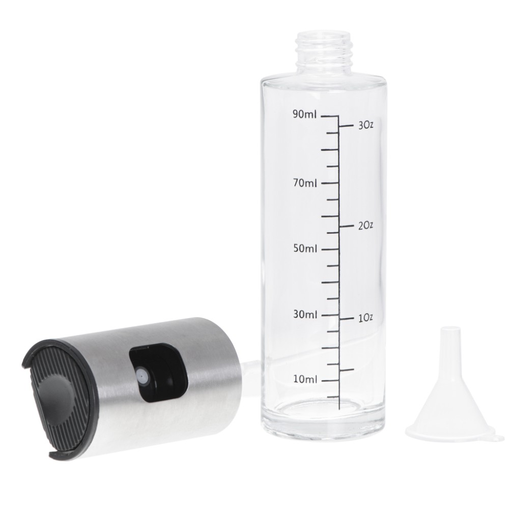 Pulverizatorul este reutilizabil. Datorită pâlniei incluse, umplerea acestuia va fi extrem de ușoară, iar gradația de pe partea laterală a flaconului vă va permite să determinați cu exactitate cantitatea de condimente lichide folosită.