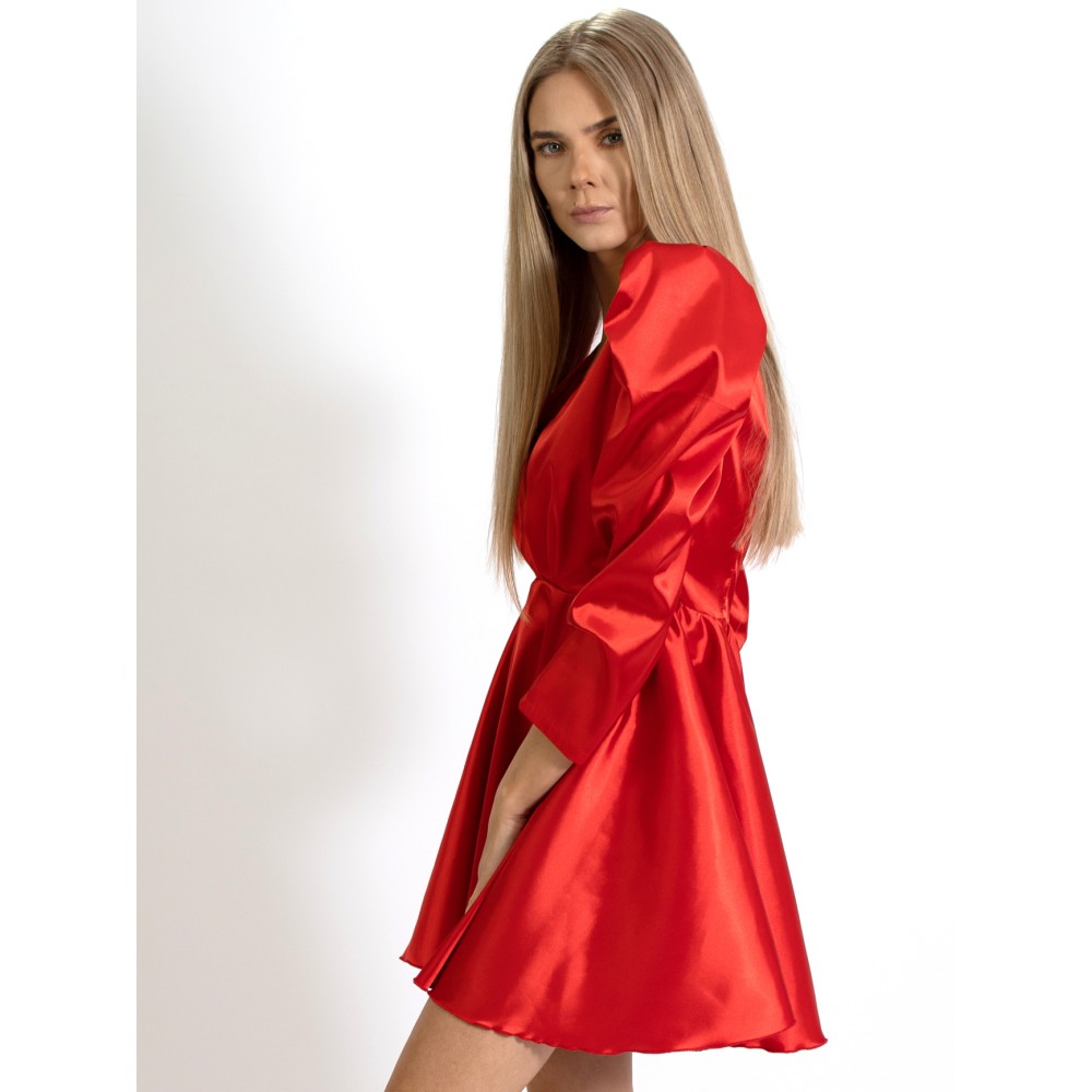 Rochie cu maneca lunga, croi in clos si umeri bufanti , din Satin. Rochita este croita cu cupe, pentru un decolteu de invidiat. Se inchide cu fermoar la spate.