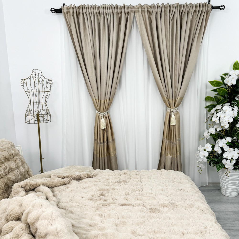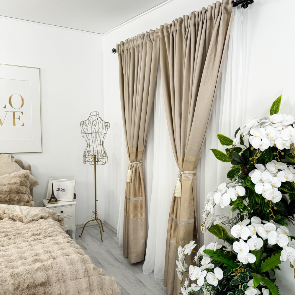 Ceea ce face draperiile cu adevărat remarcabile sunt detaliile aurii. Aceste insertii metalizate adaugă un element de strălucire și glamour, creând un contrast elegant cu textura mată a materialului. Fie că sunt plasate într-un living, într-un dormitor sau într-o sală de mese, draperiile cu insertii aurii atrag atenția și conferă o notă de opulență.