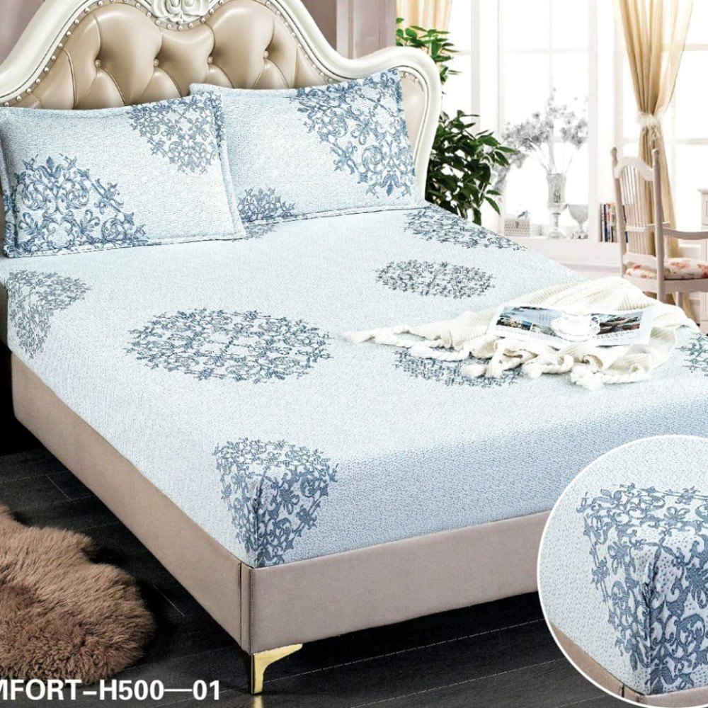 Set Cearsaf cu Elastic, 180x200cm + 2 fete de perna, 50x70cm, 3 Piese, Tercot - Confort și Eleganță în Broderii si Culori Pastelate, Bleu, East Romania, cod produs: EST-H500-01