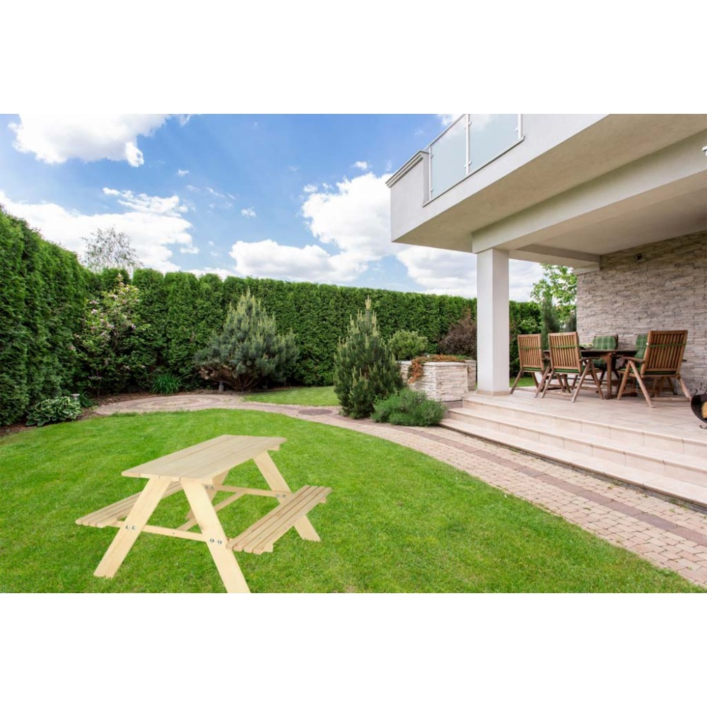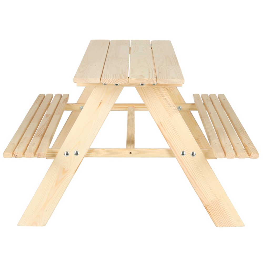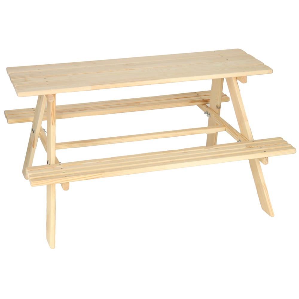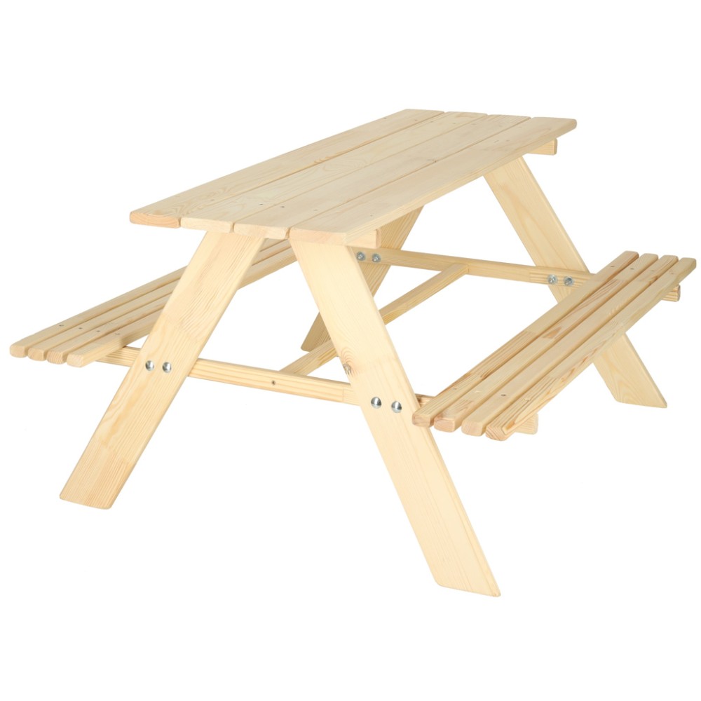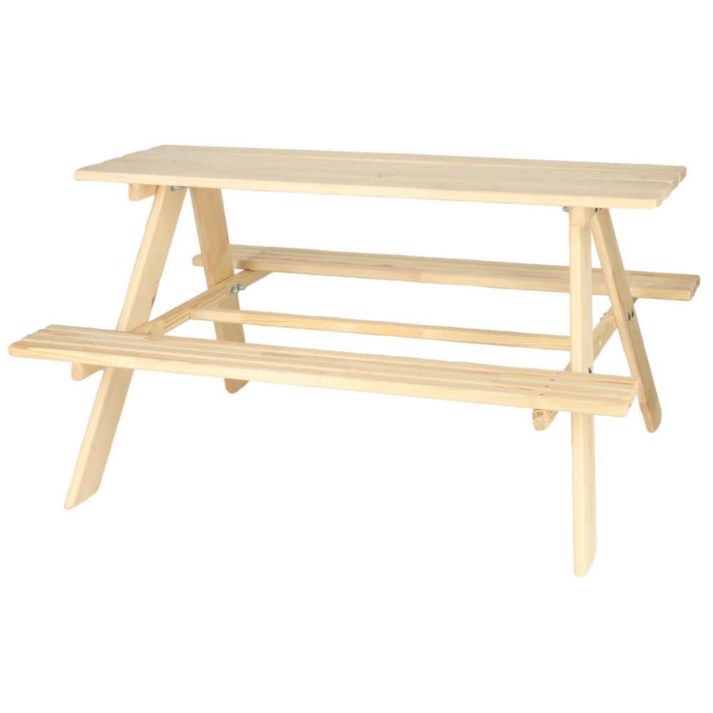 Masă de picnic din lemn pentru copii – o masă cu două bănci. Un loc ideal pentru joacă sau servirea mesei în aer liber. Cele două bănci oferă spațiu pentru mai mulți copii. Culoarea deschisă și naturală a lemnului se va integra perfect în verdeața grădinii. Înainte de a plasa mobilierul în curte, acesta trebuie impregnat.