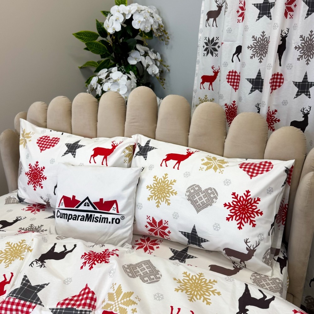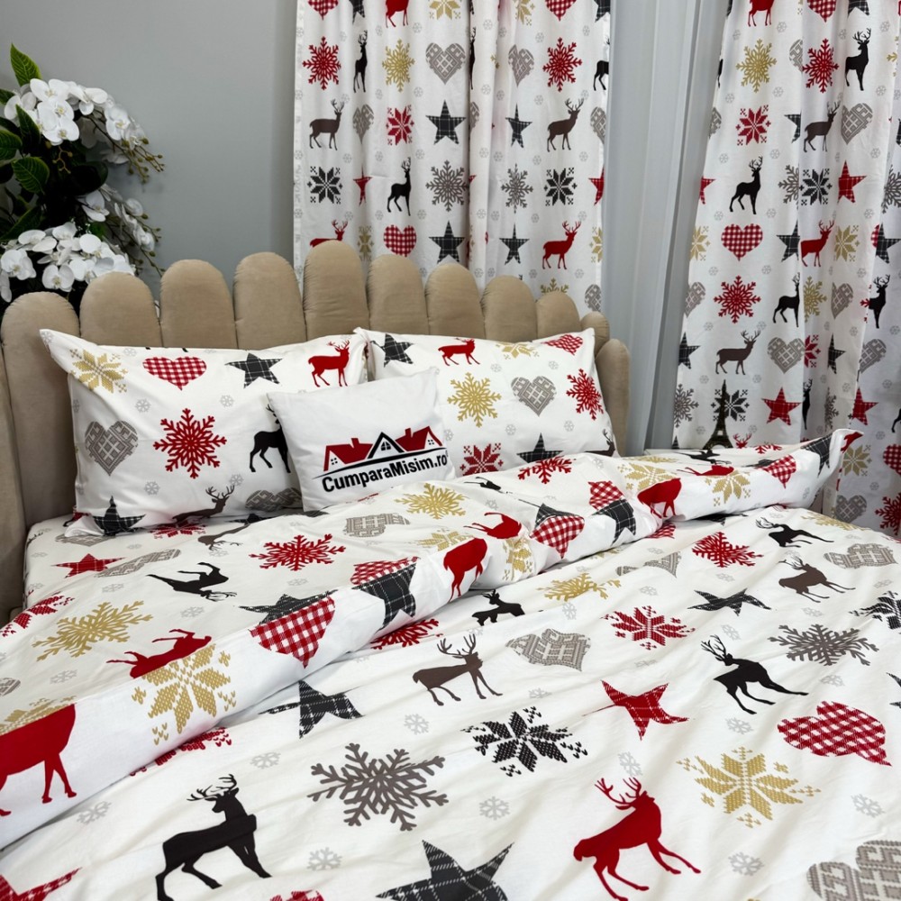 Set Lenjerie Pat Dublu Crăciun 4 Piese + 2 Draperii 150x235cm din Bumbac Ranforsat – Confort și Eleganță, Fabricat în România, Alb, Rosu, Gri, Galben, Reni, Stelute, Inimioare, Fulgi de Nea, cod produs: CMP608