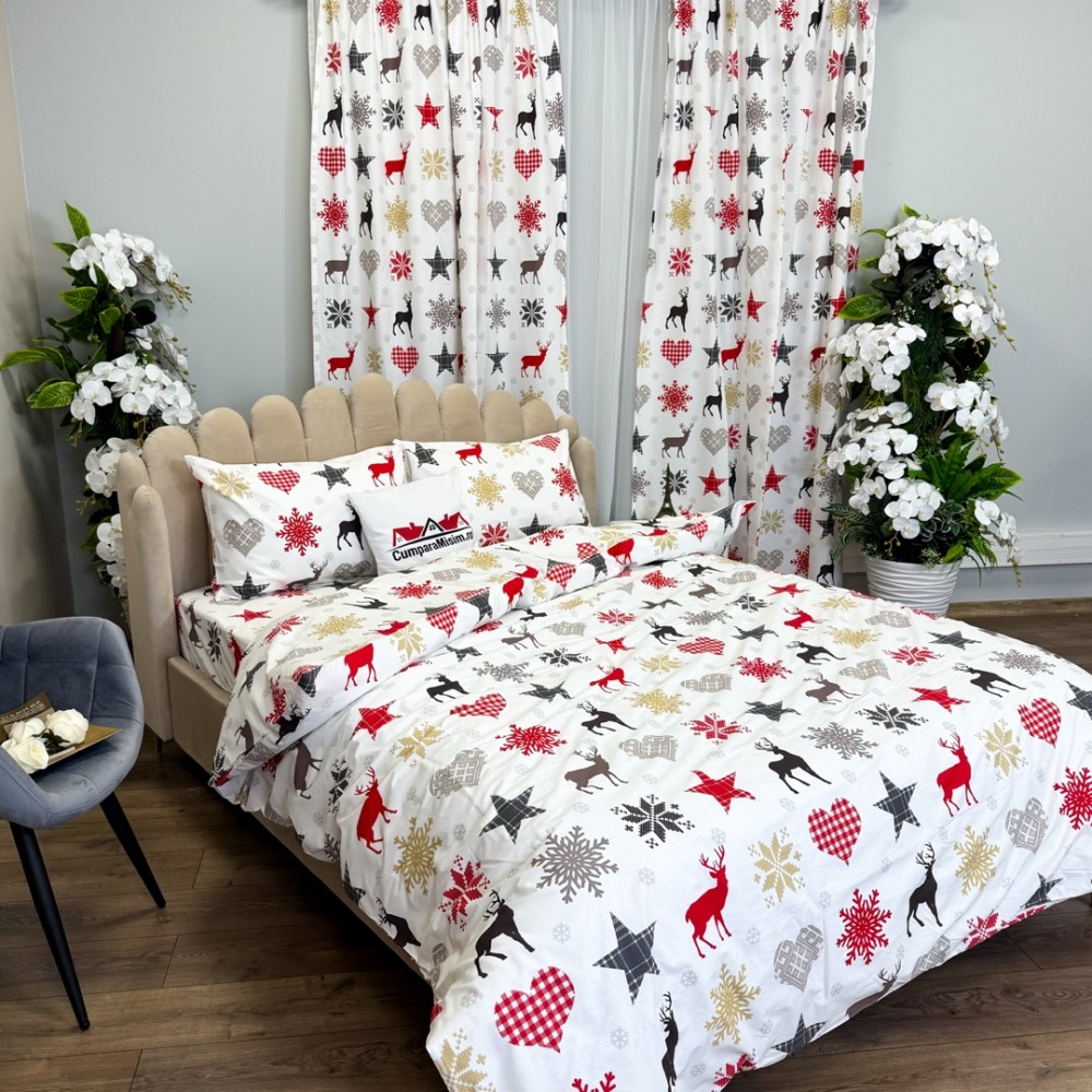 Adaugă un strop de magie de Crăciun în dormitorul tău cu setul nostru exclusiv creat în atelierul nostru de croitorie, disponibil pe CumparaMisim.ro! Fiecare piesă este realizată cu grijă și atenție la detalii, pentru a aduce un decor festiv și o atmosferă caldă, primitoare. Setul cuprinde o lenjerie de pat din 4 piese și două draperii, toate confecționate din bumbac ranforsat de cea mai bună calitate.