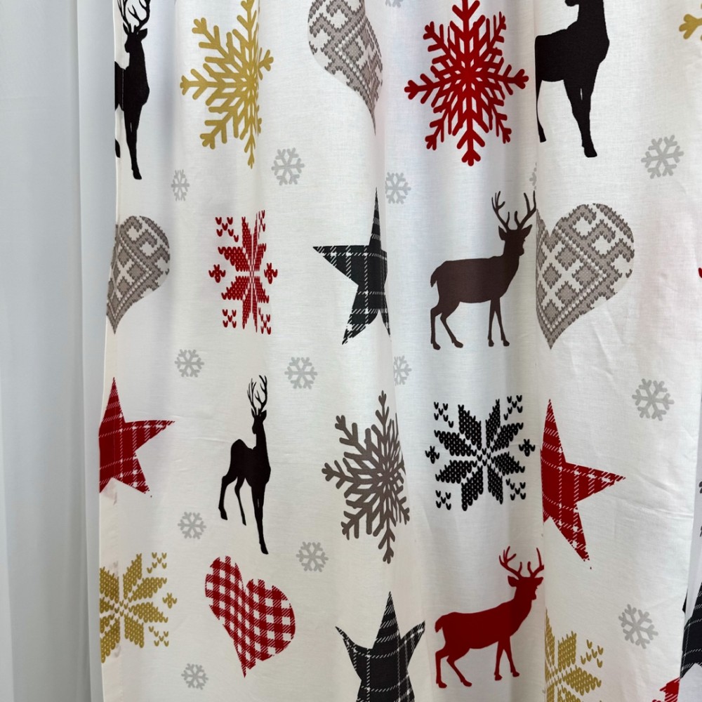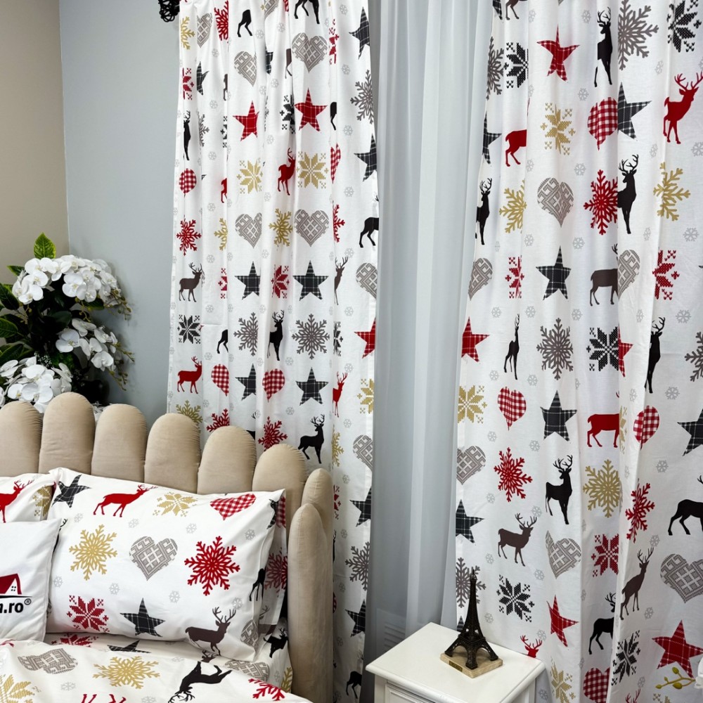 4. Două draperii 150 cm lățime x 235 cm înălțime – Draperiile sunt prevăzute cu rejansă pentru montare ușoară pe orice bară de draperii. Fabricate din același material de bumbac ranforsat, draperiile au o opacitate medie spre scăzută, ceea ce înseamnă că filtrează frumos lumina naturală, creând o atmosferă caldă și plăcută, fără a bloca complet lumina. Draperiile permit luminii să pătrundă și să ofere un efect de iluminare naturală difuză, perfectă pentru decorul de Crăciun și pentru orice alt sezon.