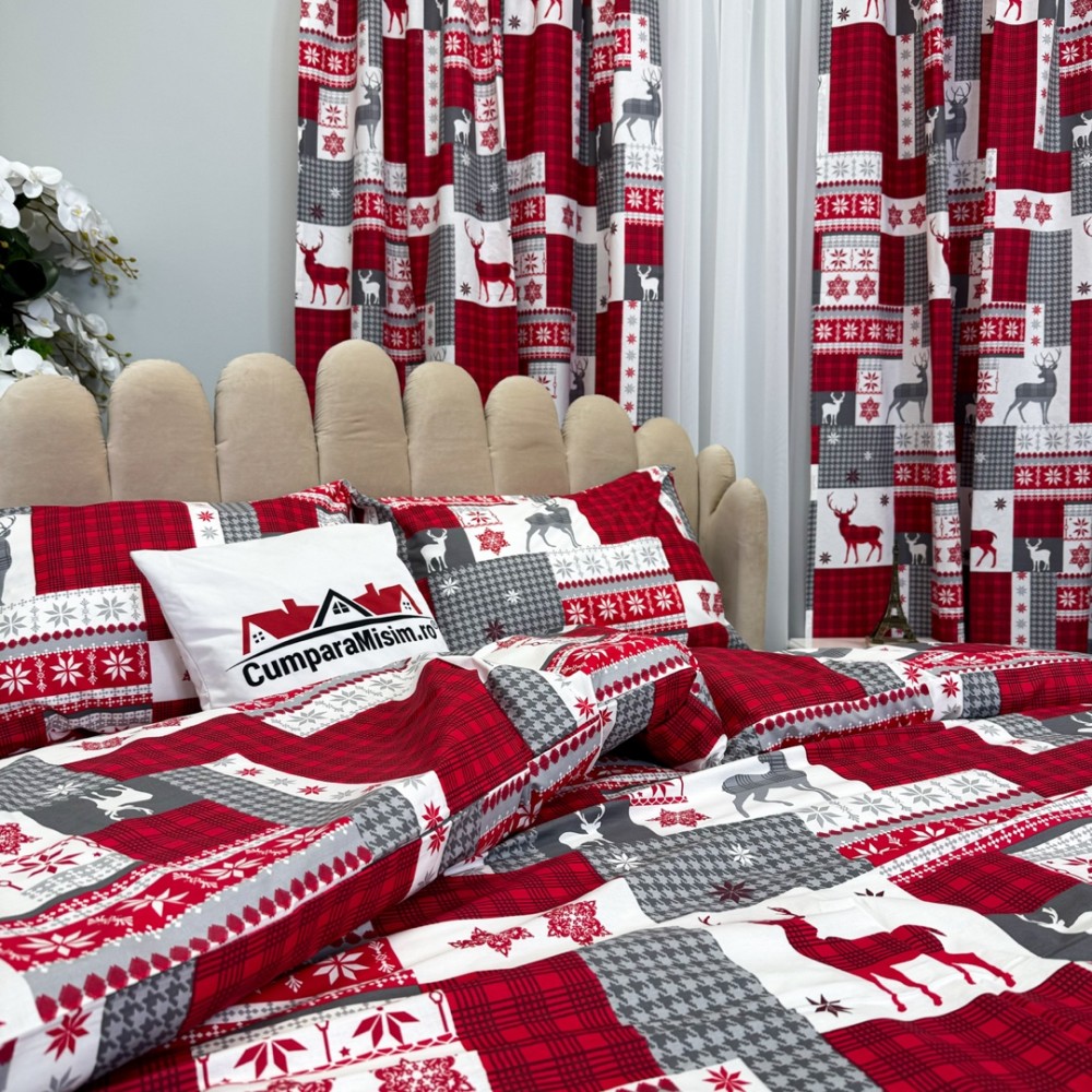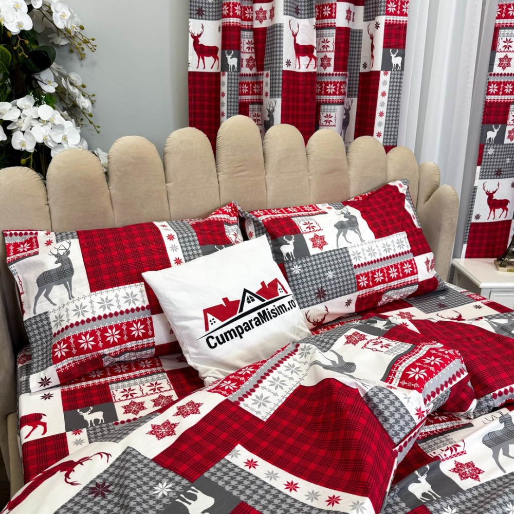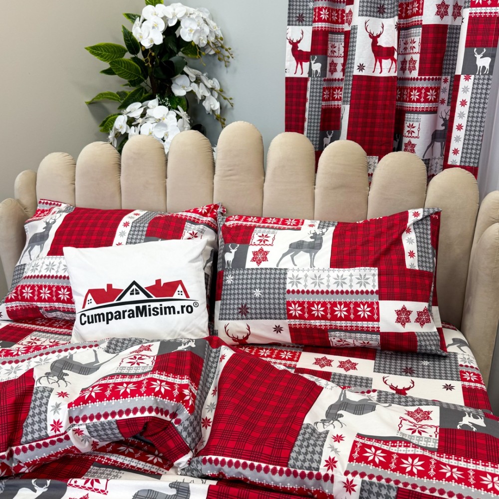 Set Lenjerie Pat Dublu Crăciun 4 Piese + 2 Draperii 150x235cm din Bumbac Ranforsat – Confort și Eleganță, Fabricat în România, Alb,Gri, Rosu, Fulgi de Zapada, Reni, Carouri, cod produs: CMP606