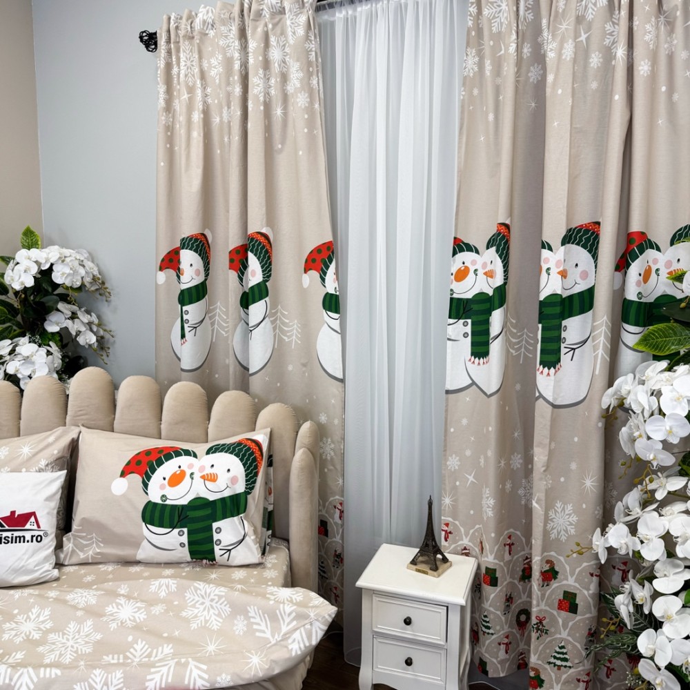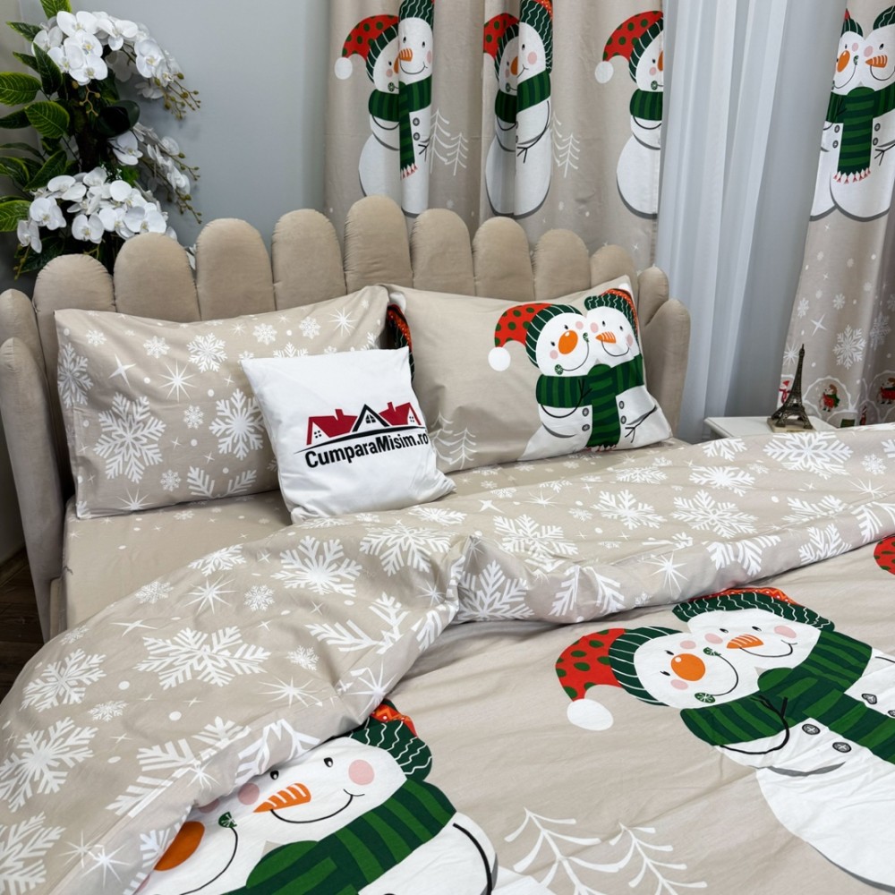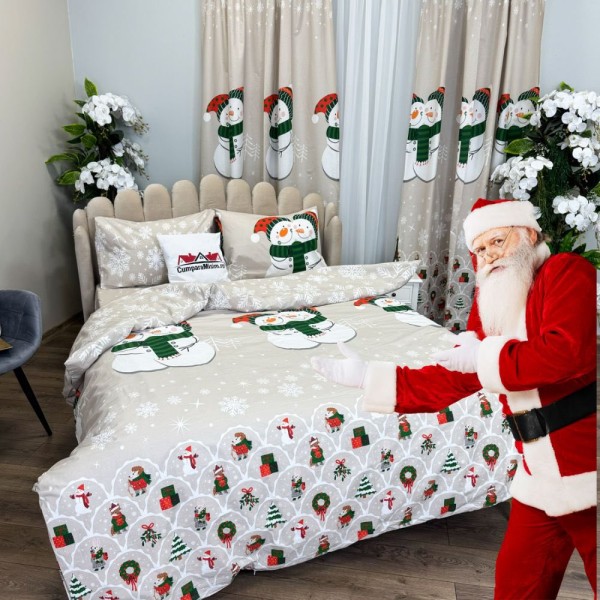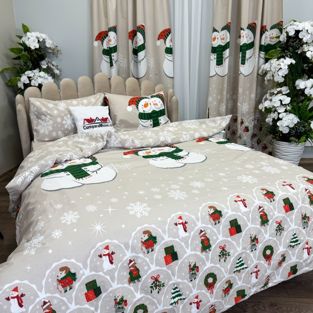 Set Lenjerie Pat Dublu Crăciun 4 Piese + 2 Draperii 150x235cm din Bumbac Ranforsat – Confort și Eleganță, Fabricat în România, Bej, Verde, Rosu, Oameni de Zapada, brazi, fulgi de nea, cod produs: CMP602