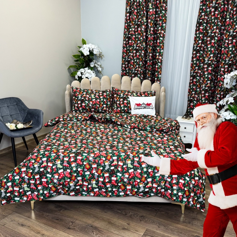 Adaugă un strop de magie de Crăciun în dormitorul tău cu setul nostru exclusiv creat în atelierul nostru de croitorie, disponibil pe CumparaMisim.ro! Fiecare piesă este realizată cu grijă și atenție la detalii, pentru a aduce un decor festiv și o atmosferă caldă, primitoare. Setul cuprinde o lenjerie de pat din 4 piese și două draperii, toate confecționate din bumbac ranforsat de cea mai bună calitate.
