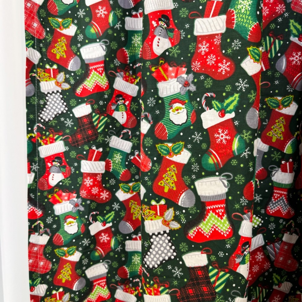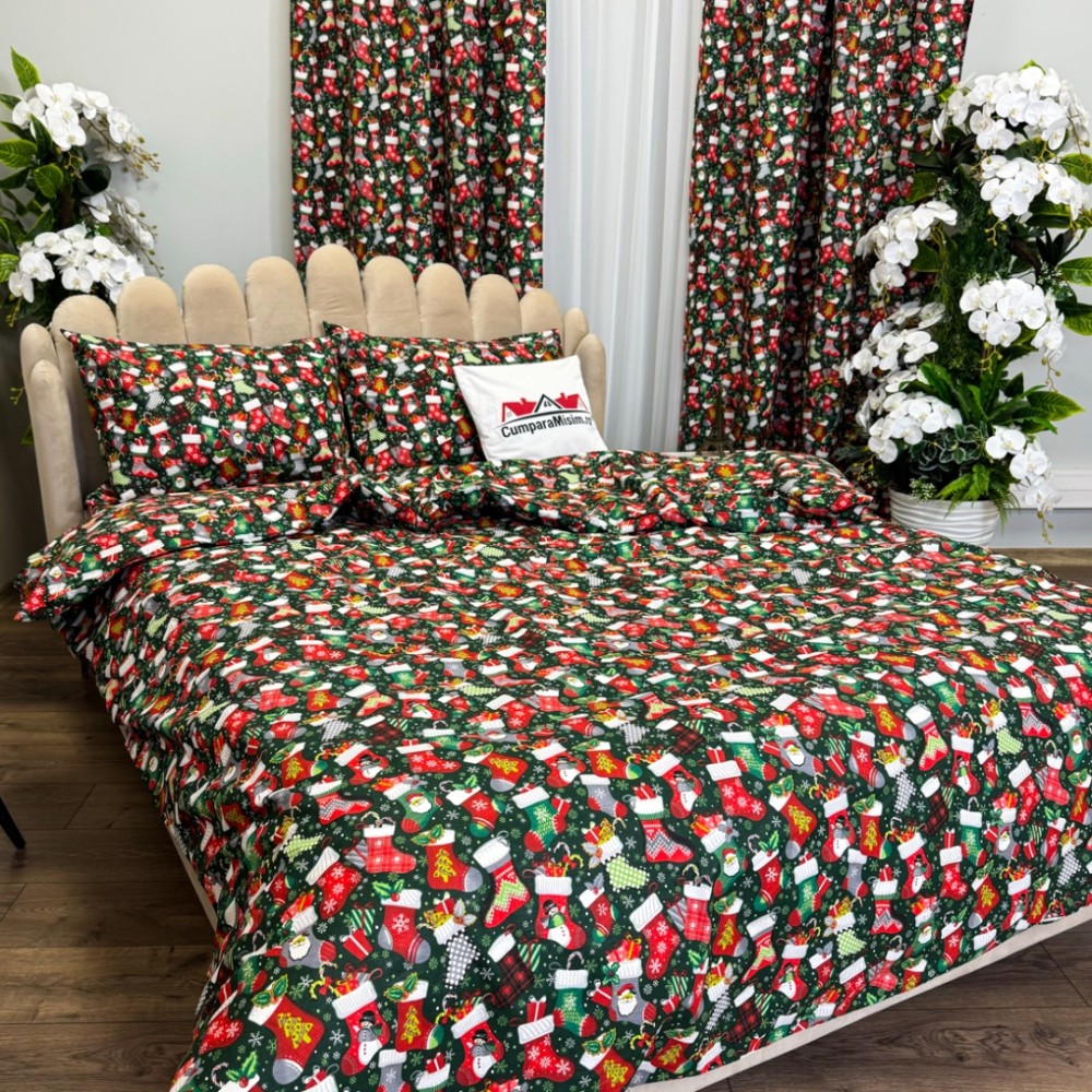 Set Lenjerie Pat Dublu Crăciun 4 Piese + 2 Draperii 150x235cm din Bumbac Ranforsat – Confort și Eleganță, Fabricat în România, Verde, ciorapii, fulgi de nea, cod produs: CMP612