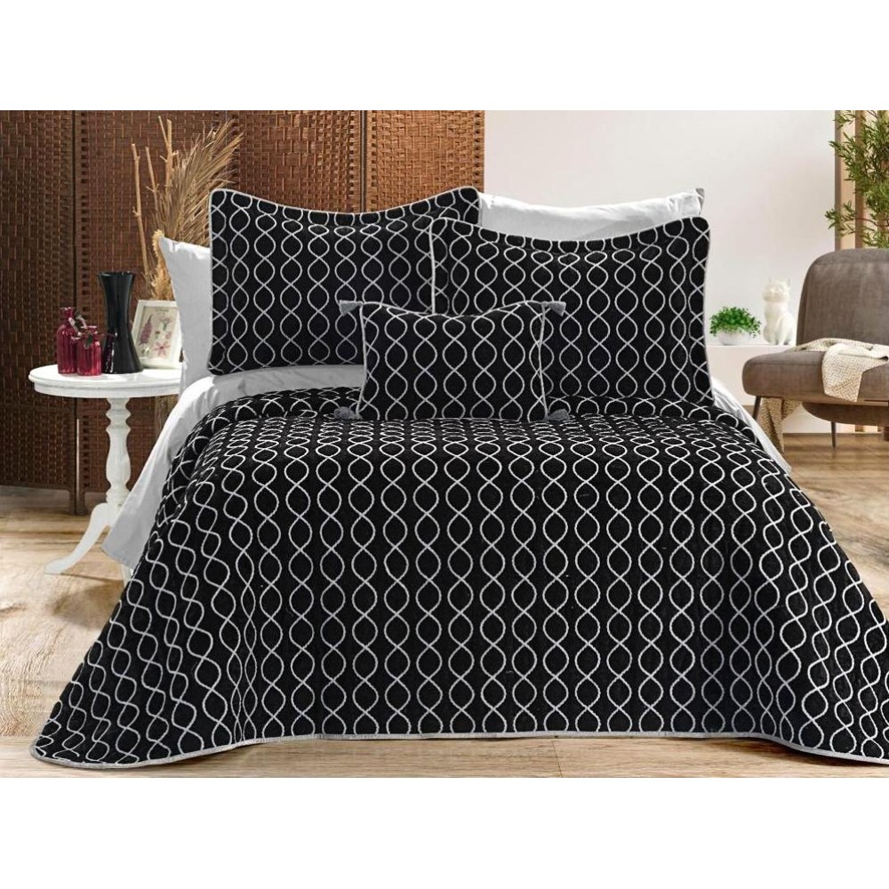 Set LUXURY 4 piese, Cuvertura Brodata Catifea, 2 fete de perna si o pernuta decor, BRILLANT Negru-Gri, Casa Sabry, cod produs: CPS130