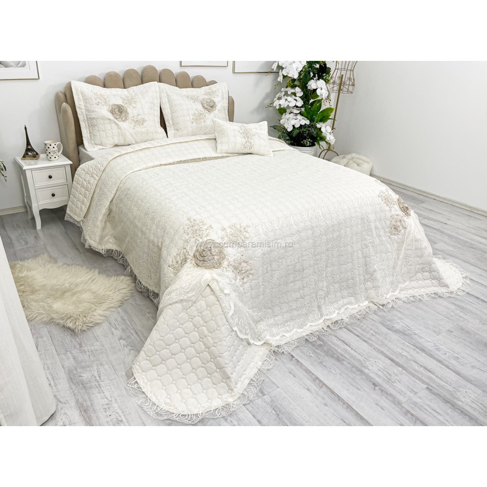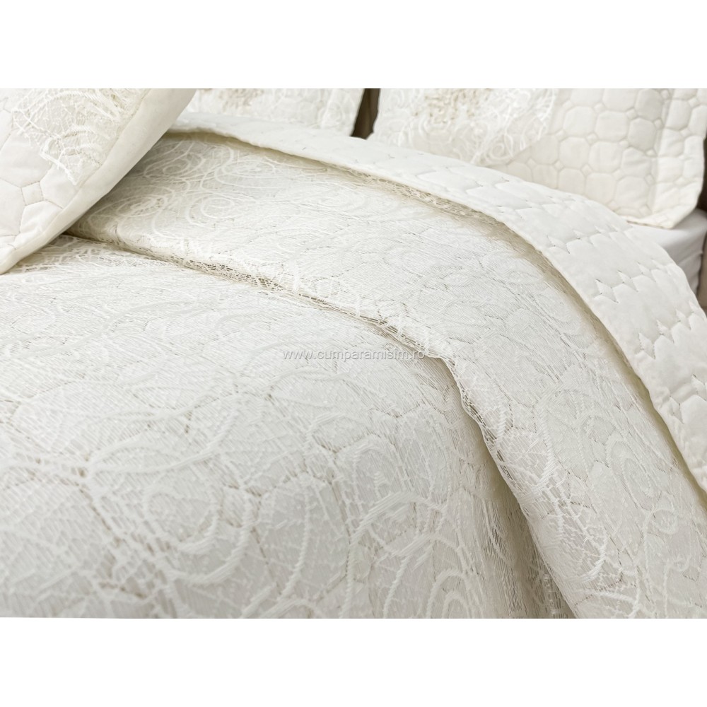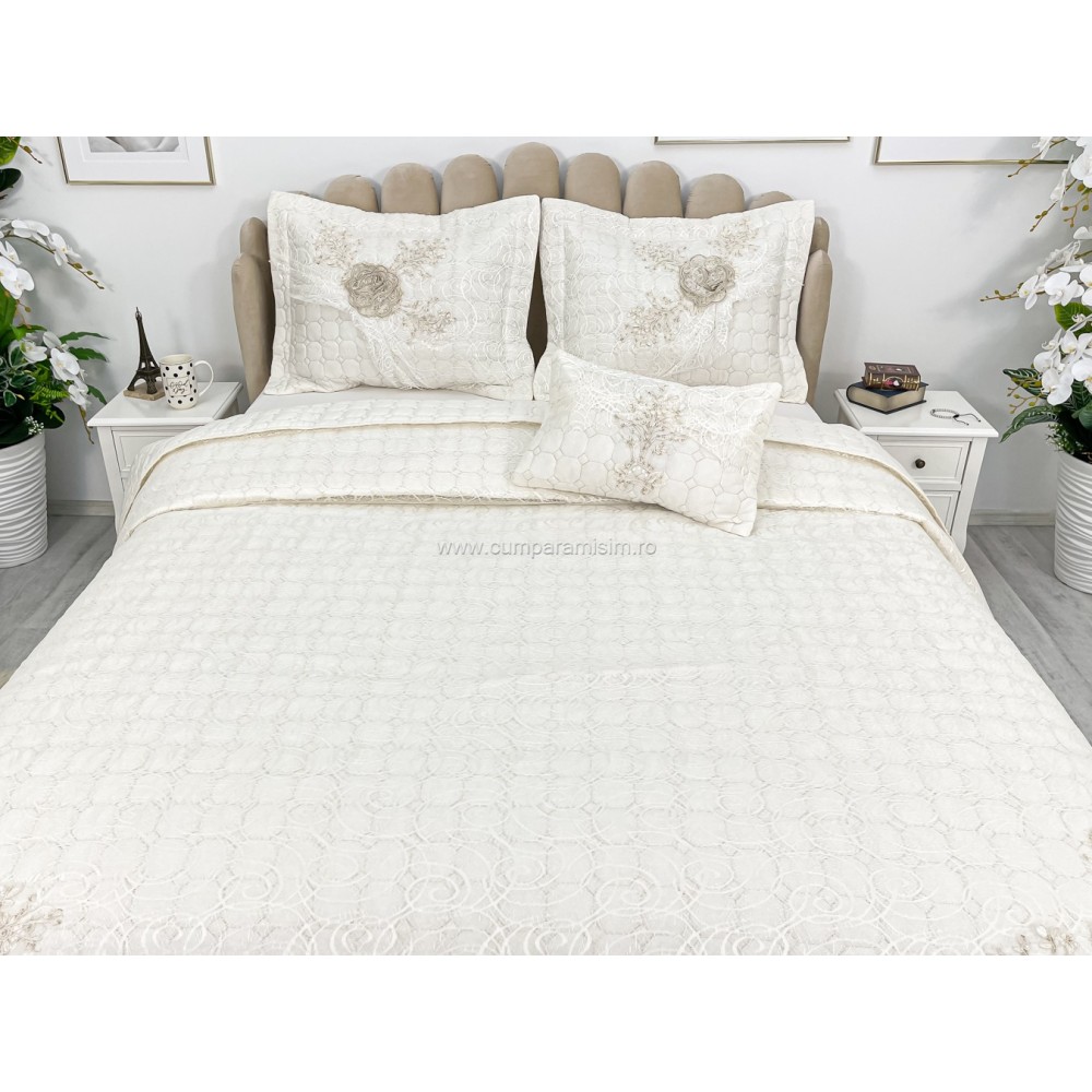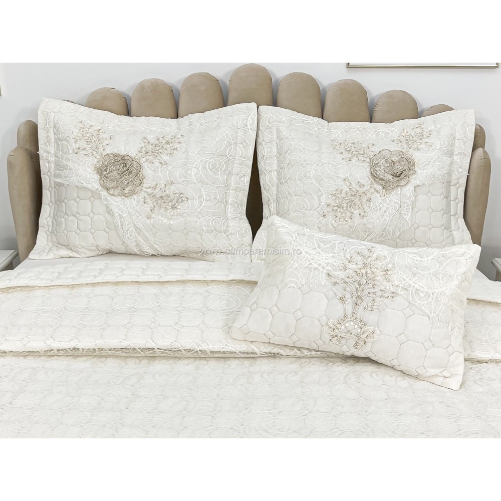 Cuvertura cu model in relief si aplicatii de dantela pe o parte, o parte pufoasa si 3 fete de perna din bumbac.