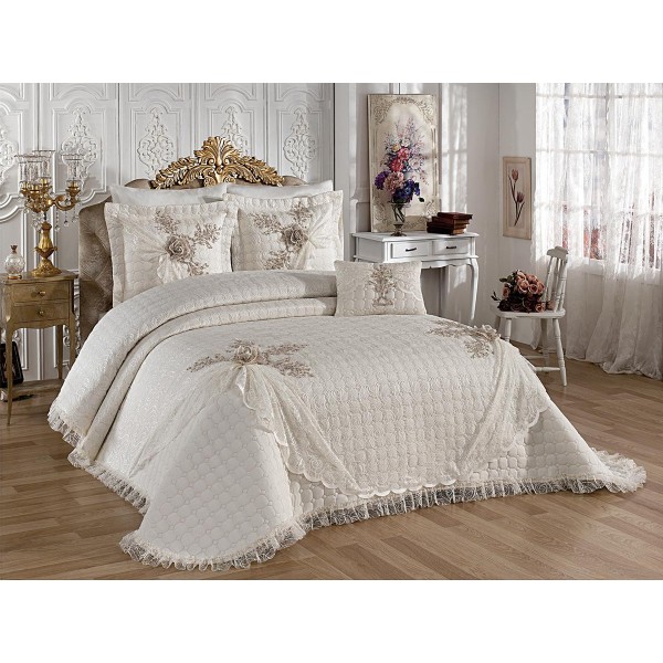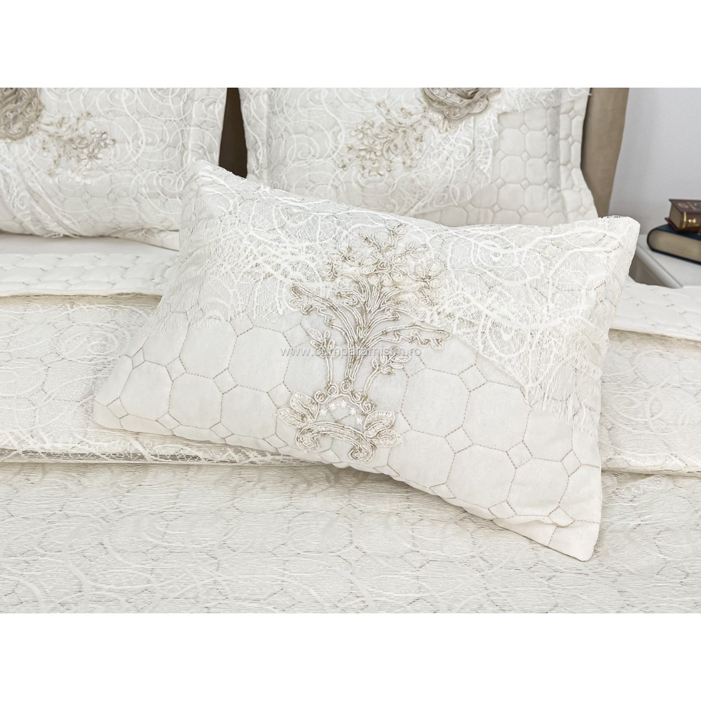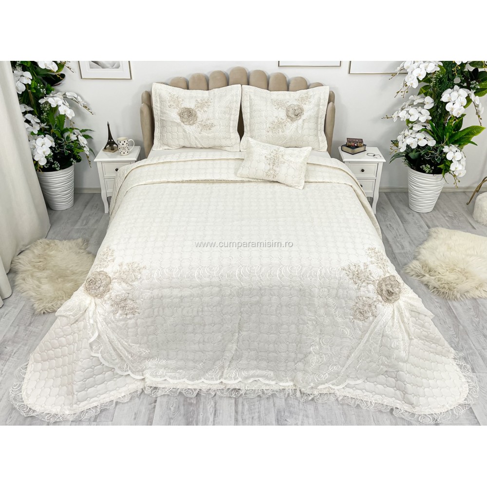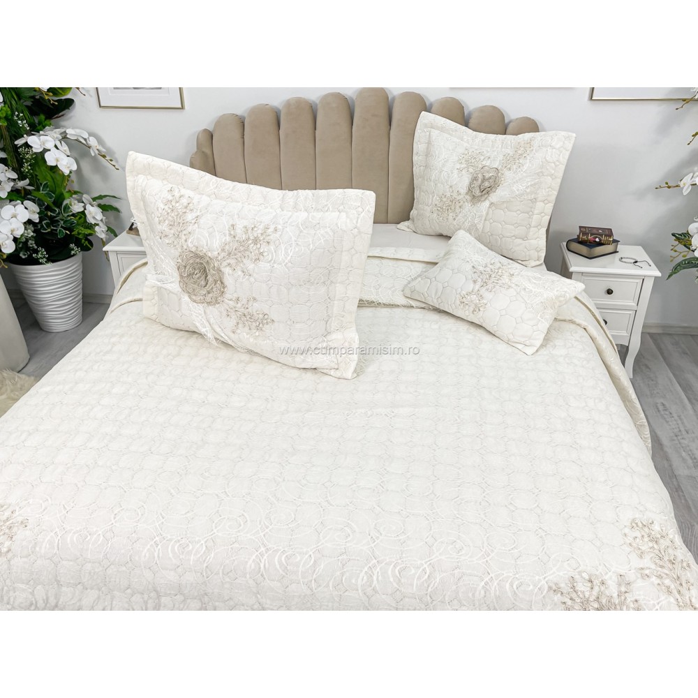 Cuvertura cu model in relief si aplicatii de dantela pe o parte, o parte pufoasa si 3 fete de perna din bumbac.
