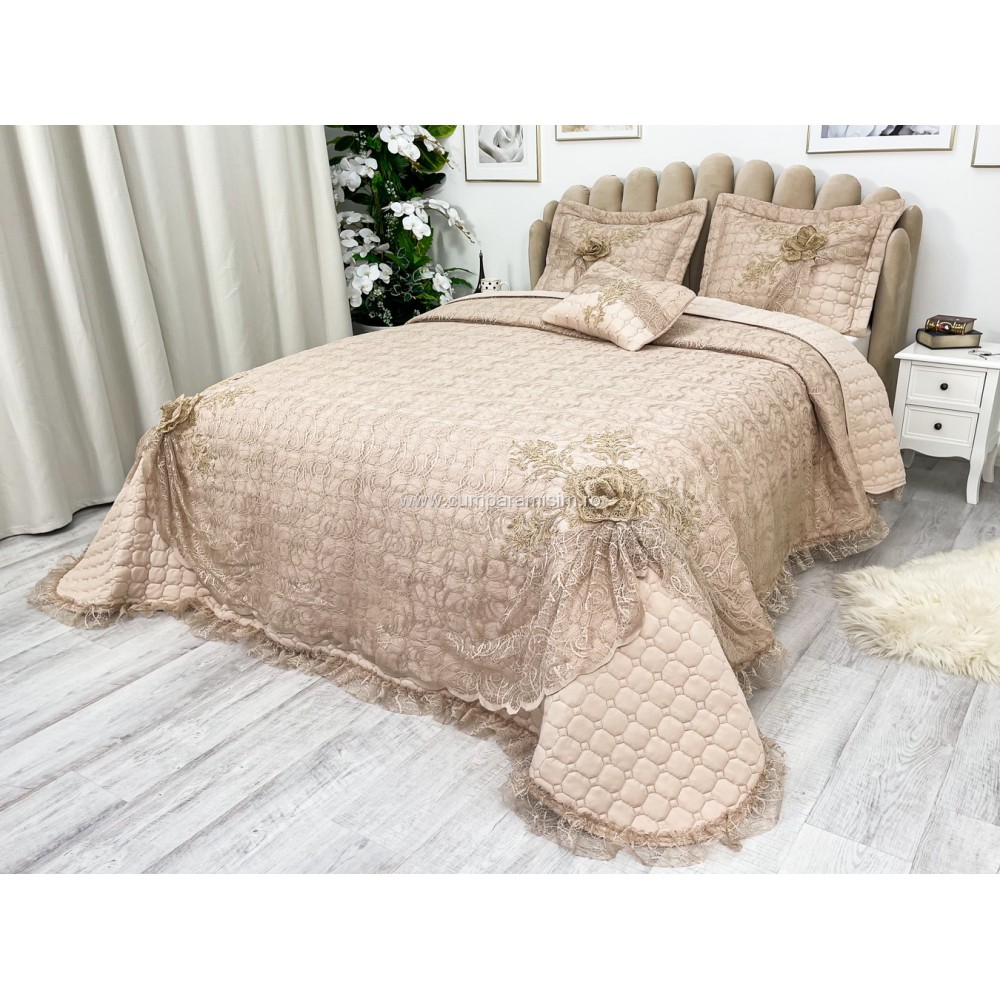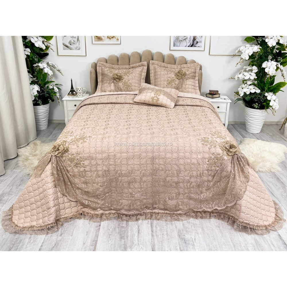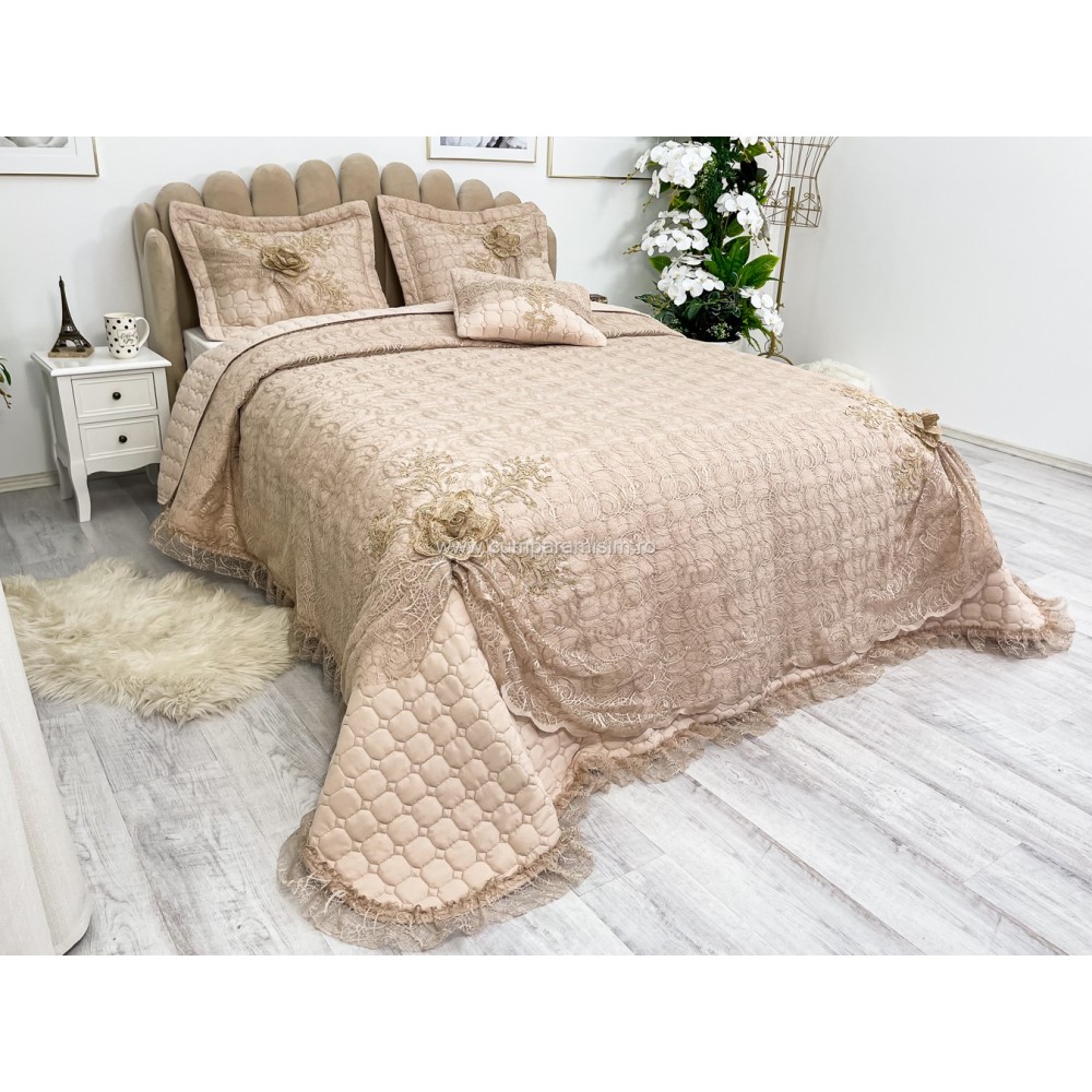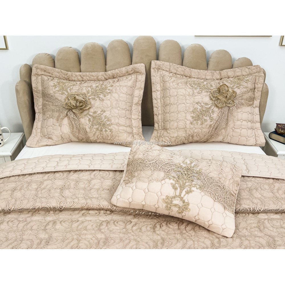 Set LUXURY 4 piese Cuvertura bumbac cu dantela si 3 fete de perna, Goncagul Capuccino, Casa Sabry, cod produs: CPS12