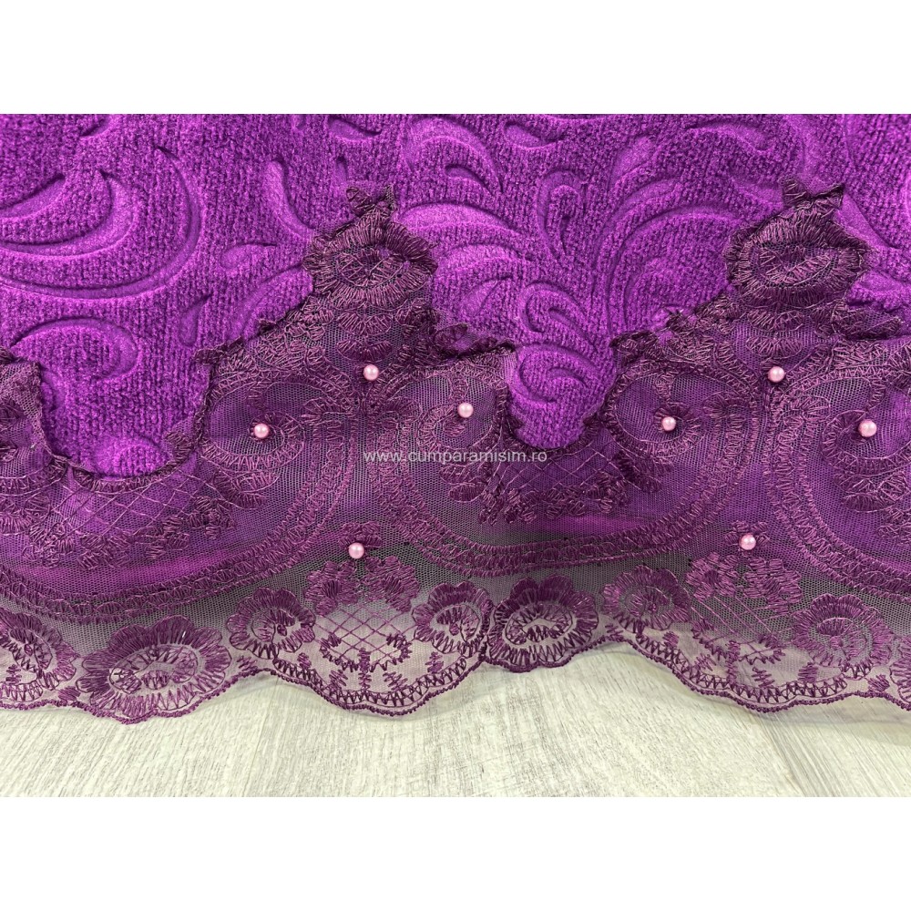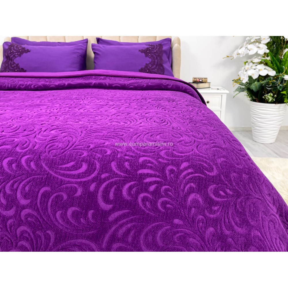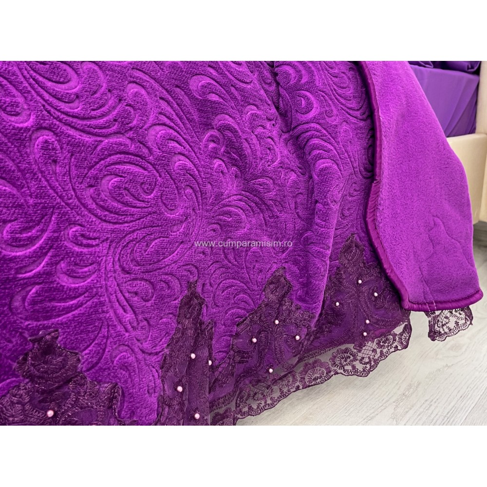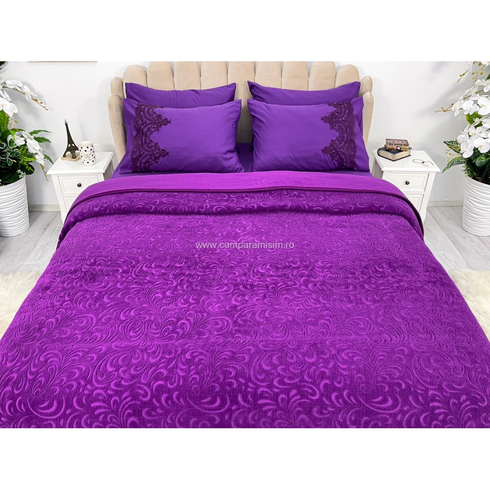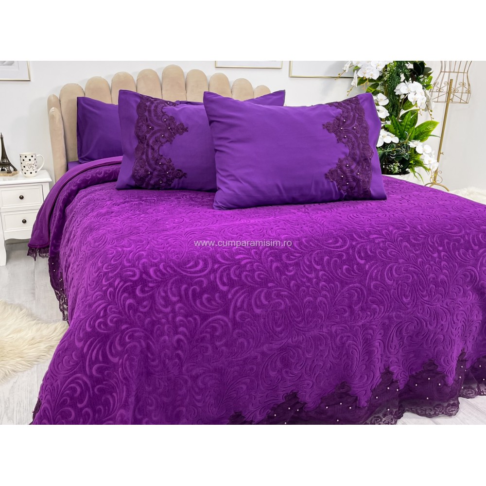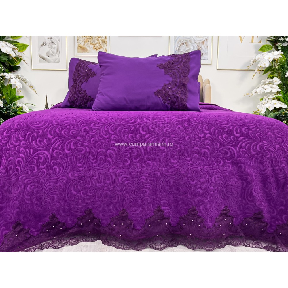 Set LUXURY GONCAGUL 6 piese Patura cu dantela,perle si Cearsaf de pat cu 4 fete de perna, Mov, Casa Sabry, cod produs: CPS6