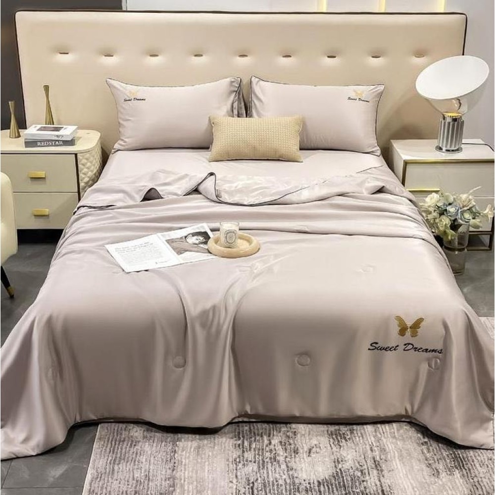 Set luxury cu PILOTA de VARA, din MATASE SATINATA, 4 piese, Grej, Johny Home Pucioasa, cod produs: SPR-MTS-02