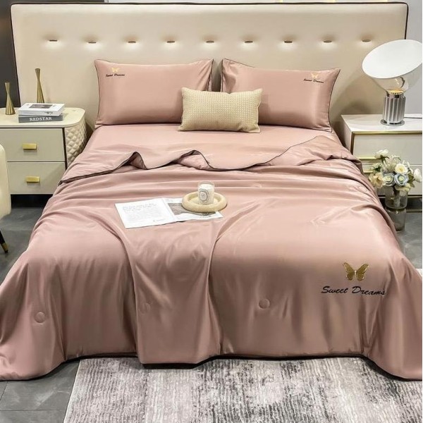 Set luxury cu PILOTA de VARA, din MATASE SATINATA, 4 piese, Pudra, Johny Home Pucioasa, cod produs: SPR-MTS-07
