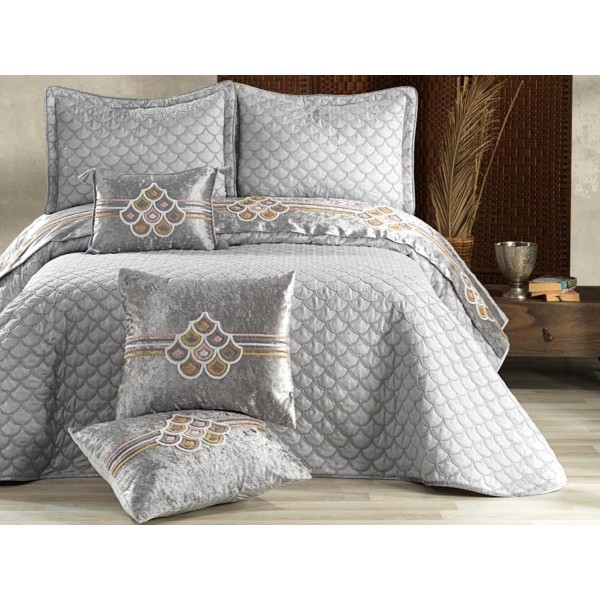 Cuvertura cu model brodat in relief din catifea pe o parte, o parte satinata si 5 fete de