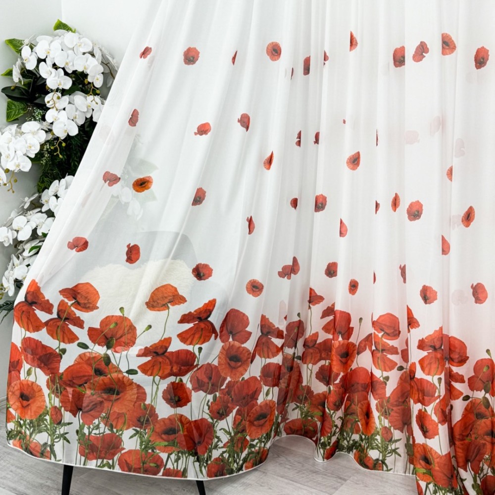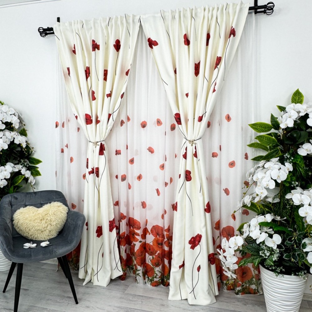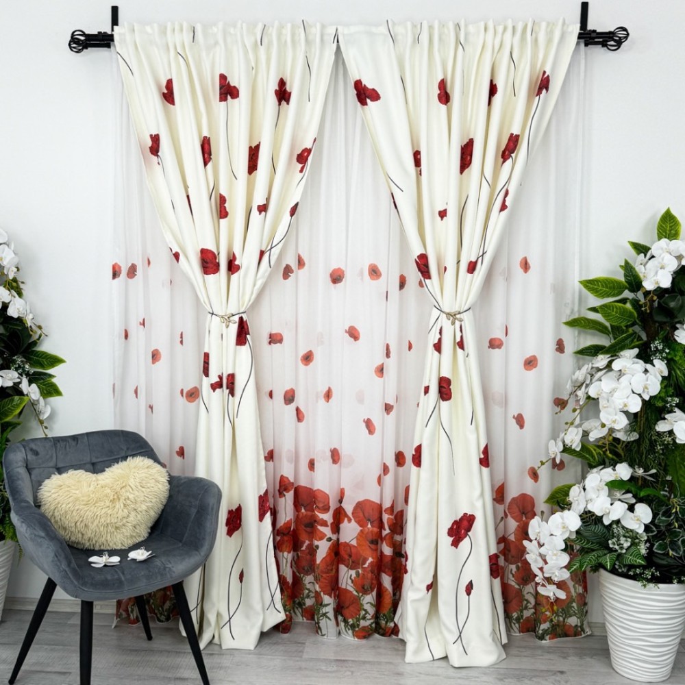 Set Perdea din Matase si Draperie Satinata imprimata, Alb cu Maci rosii, PERDEA - 1 BUC 3m latime, DRAPERIE - 2 Buc de 1m latime, inaltime 2m, cu rejansa pt sina, CumparaMisim, cod produs: CSR-PD13-DR100h