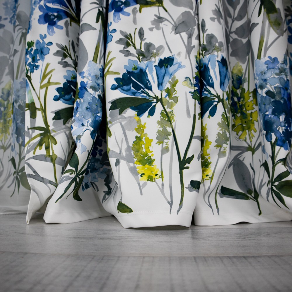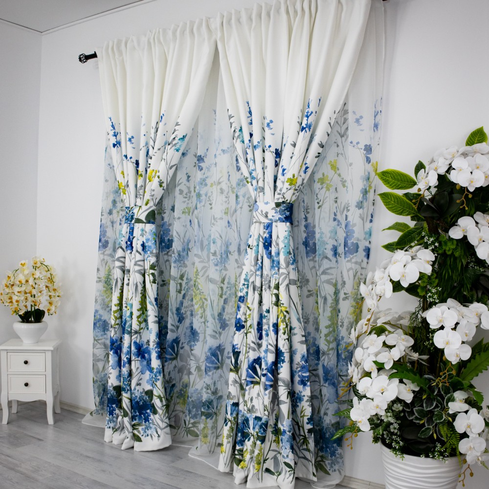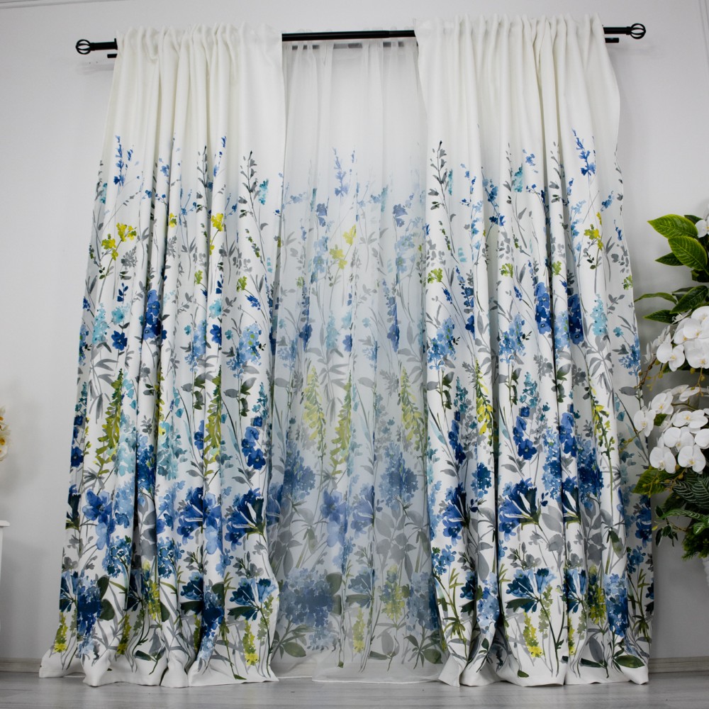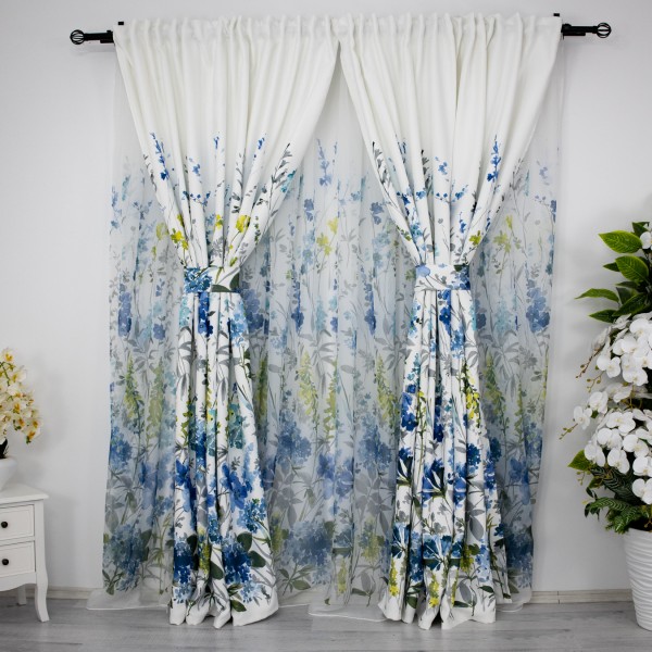 Set Perdea din Voal si Draperie Satinata imprimata, flori albastre, perdea de 3m latime x 2m inaltime, si 2 buc draperie 1m latime x 2 m inaltime, cu rejansa pt sina, CumparaMisim, cod produs: BPD13-BDR13x