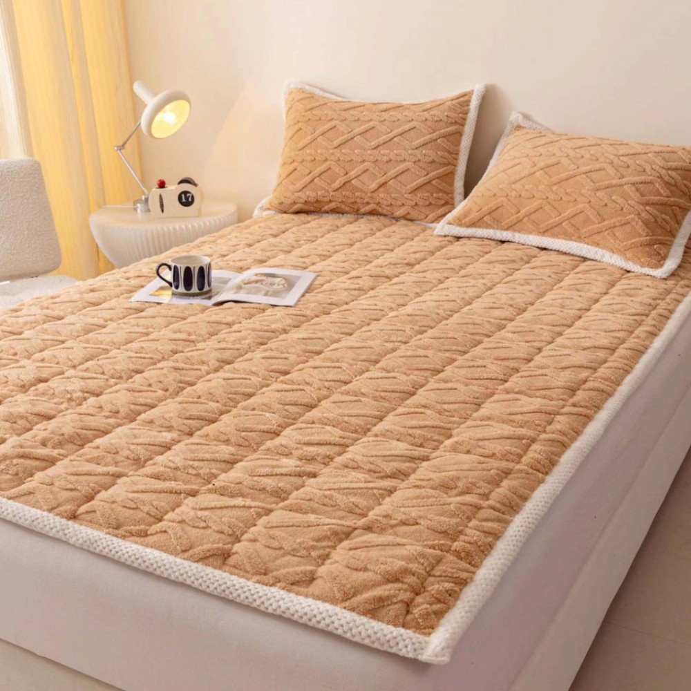 Topper Cocolino Matlasat 160x200cm cu Elastic pe colturi și Două Fețe de Pernă 50x70cm, model Tricotat in Relief, cu bordura contrastanta, Camel, Alti producatori, cod produs: FYT505