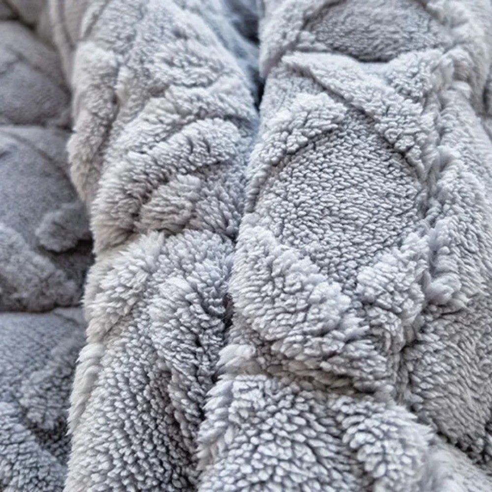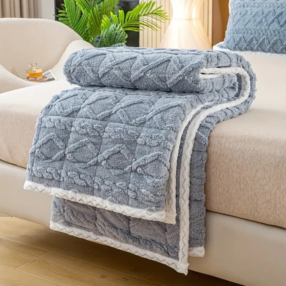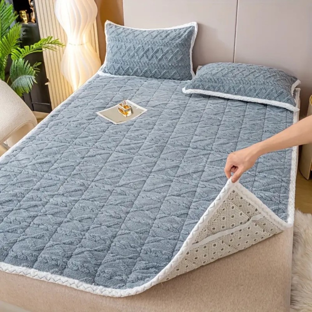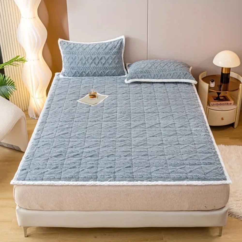 Topper Cocolino Matlasat 160x200cm cu Elastic pe colturi și Două Fețe de Pernă 50x70cm, model Tricotat in Relief, cu bordura contrastanta, Gri albastrui, Alti producatori, cod produs: FYT509