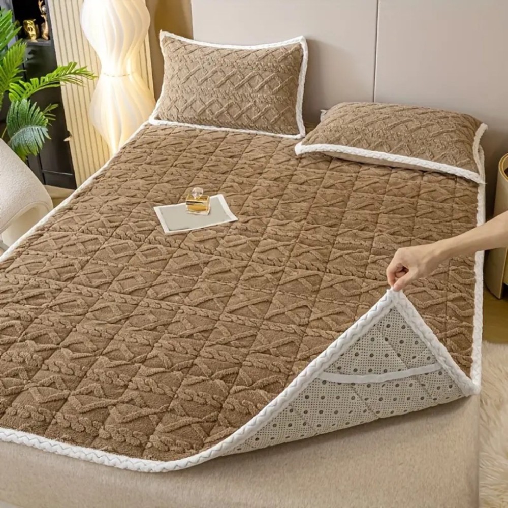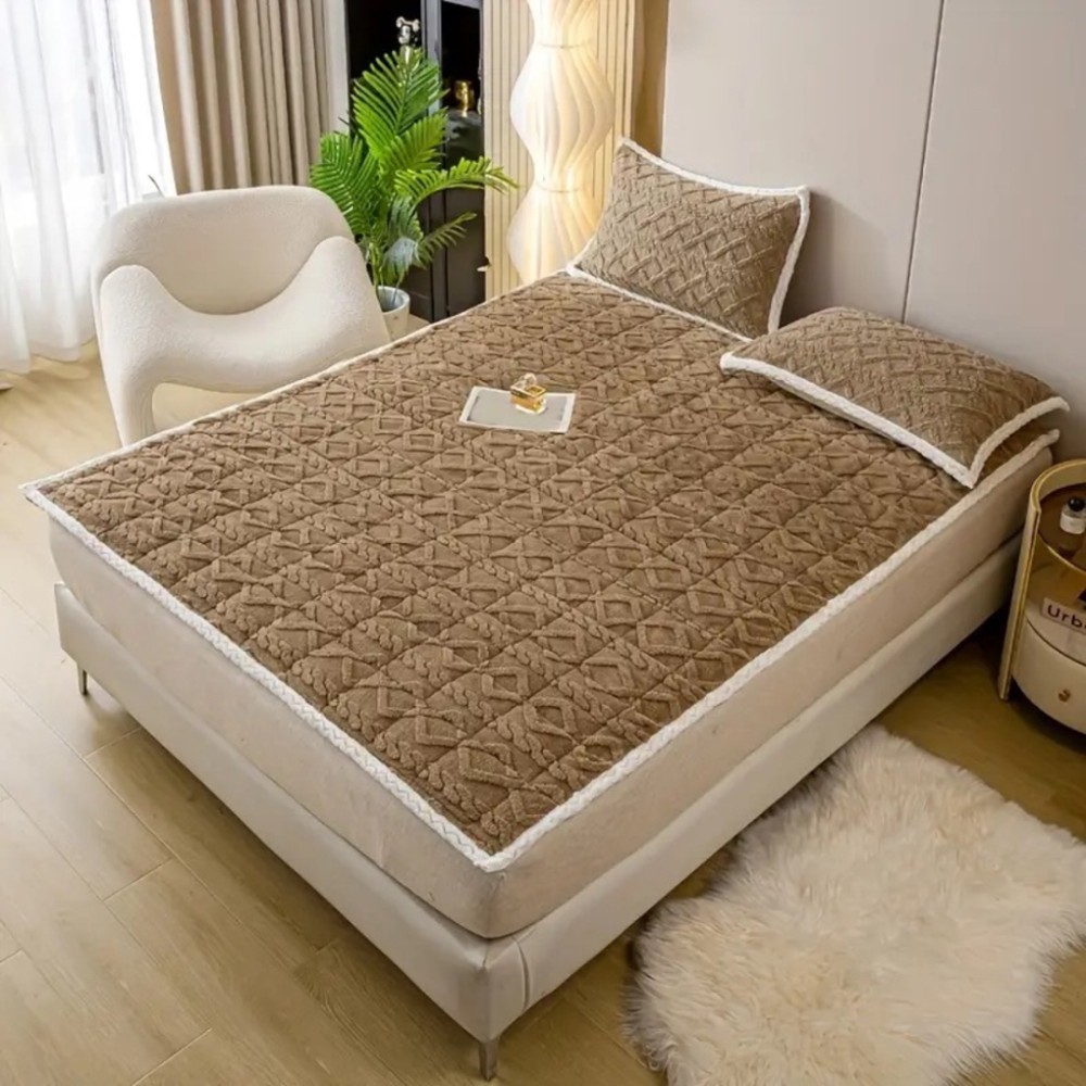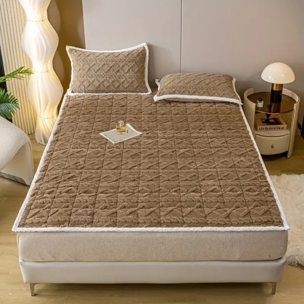 Topper Cocolino Matlasat 180x200cm cu Elastic pe colturi și Două Fețe de Pernă 50x70cm, model Tricotat in Relief, cu bordura contrastanta, Maro, Alti producatori, cod produs: FYT608